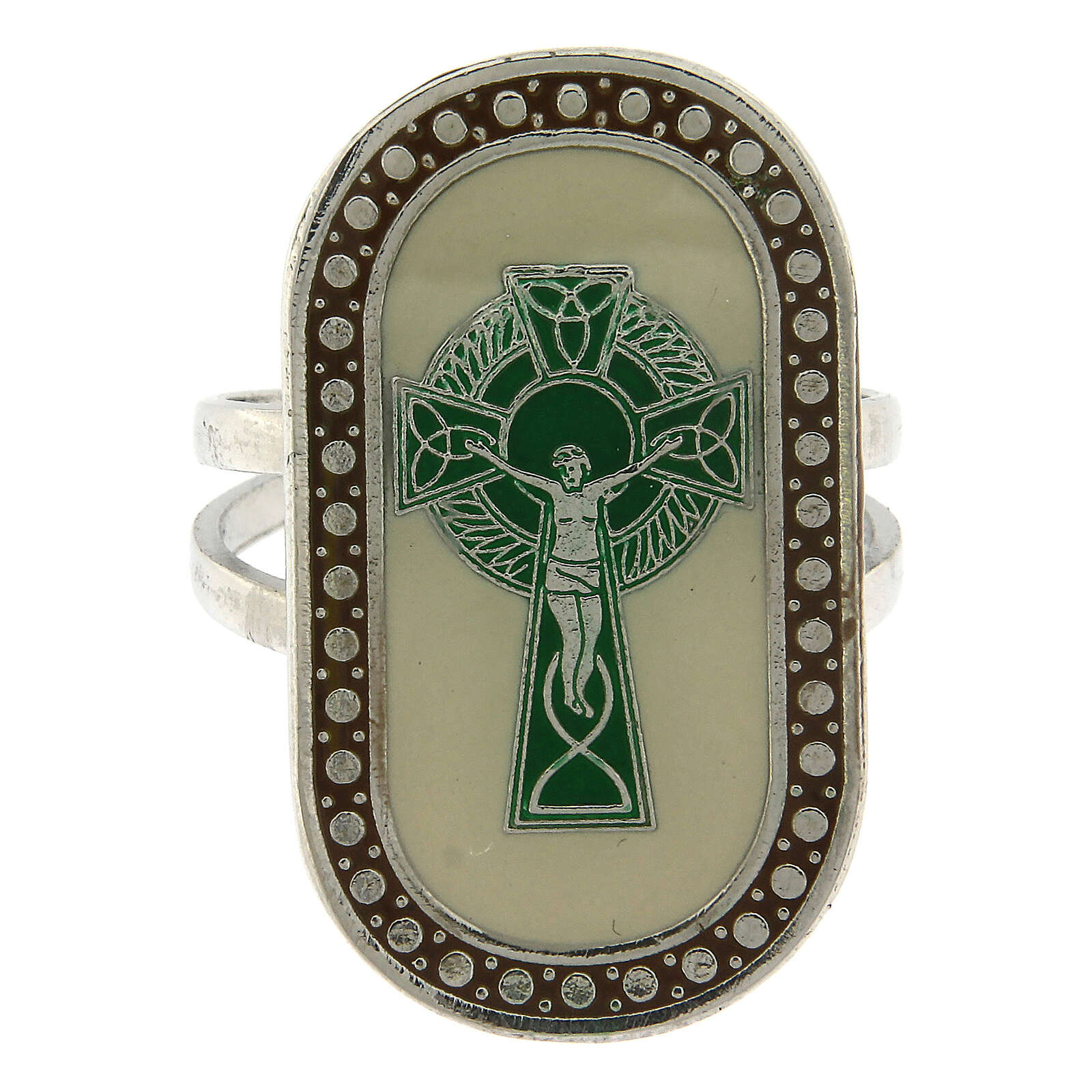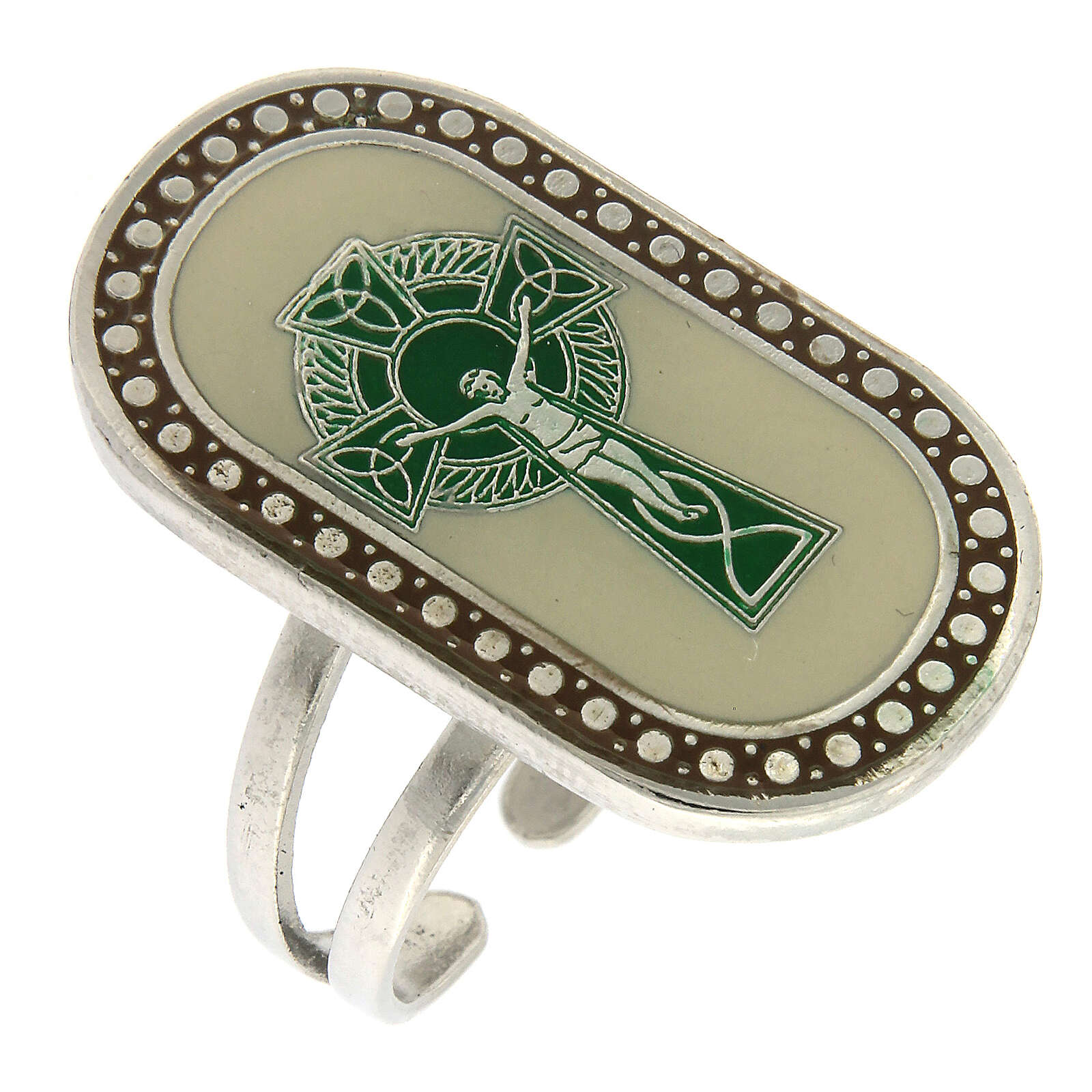 Bague réglable Croix Saint Patrick couleur ivoire. Bague avec Croix de Saint Patrick verte sur fond couleur ivoire émaillé, réalisée en métal avec médaille en zamak et finie avec bain galvanique en bronze blanc sans nickel.