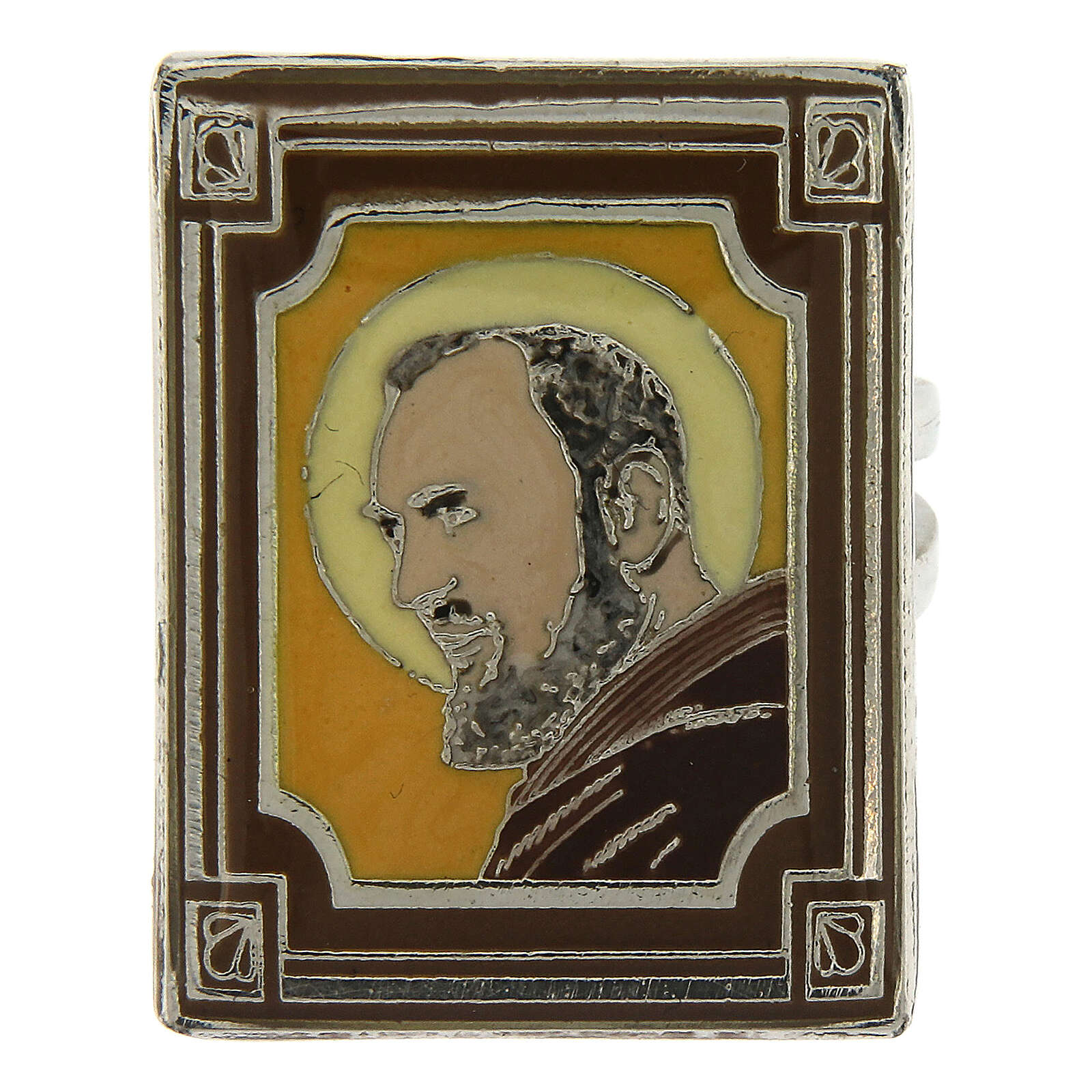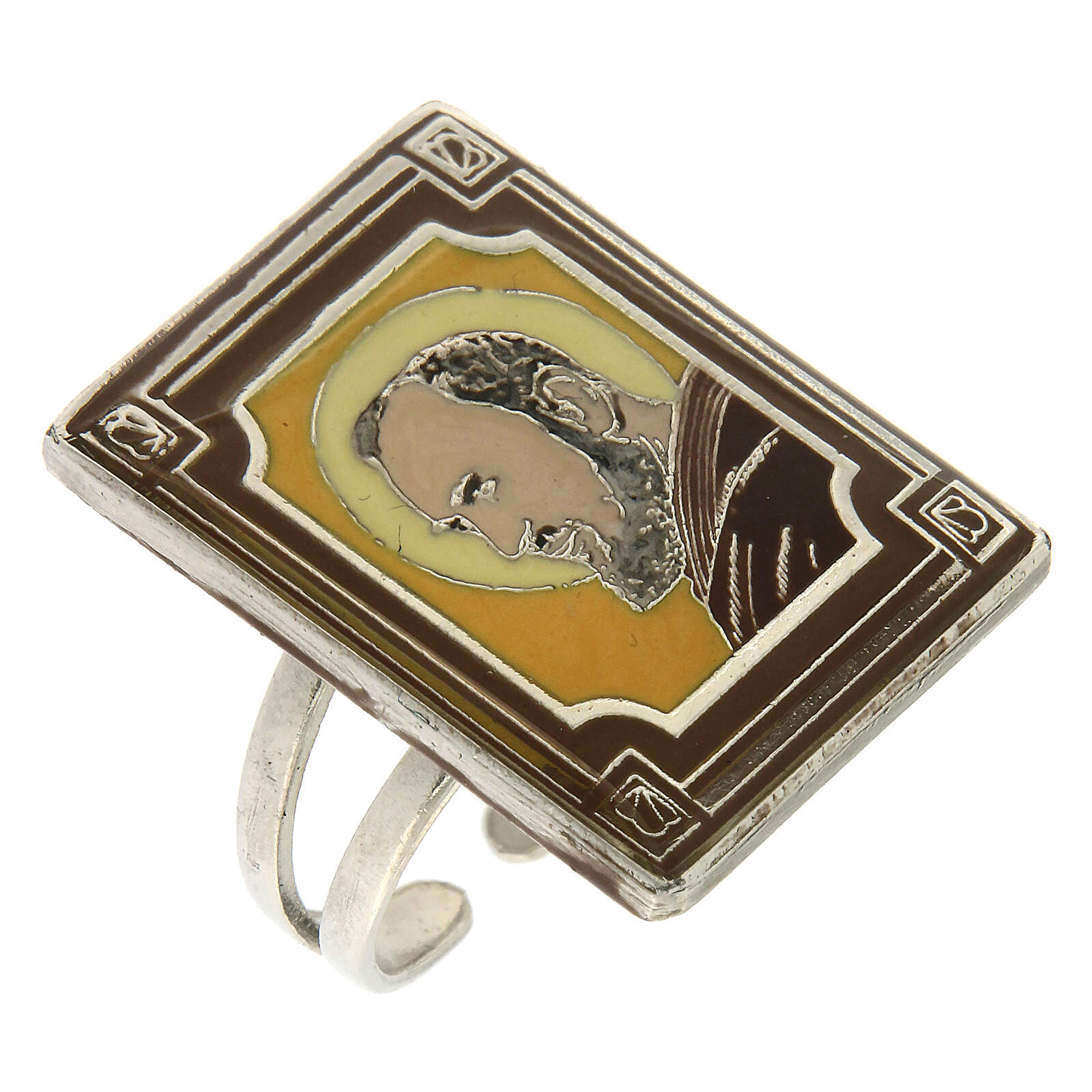 Bague réglable Saint Pio de Pietrelcina jaune ocre. Bague représentant Padre Pio sur fond vert émaillé sur une médaille de 2,5x1,9 cm en zamak. L'émail est appliqué à la main par du personnel spécialisé à l'aide d'une seringue dans le but d'offrir une haute définition des détails et protégé par une couche de résine transparente pour un effet encore plus brillant.