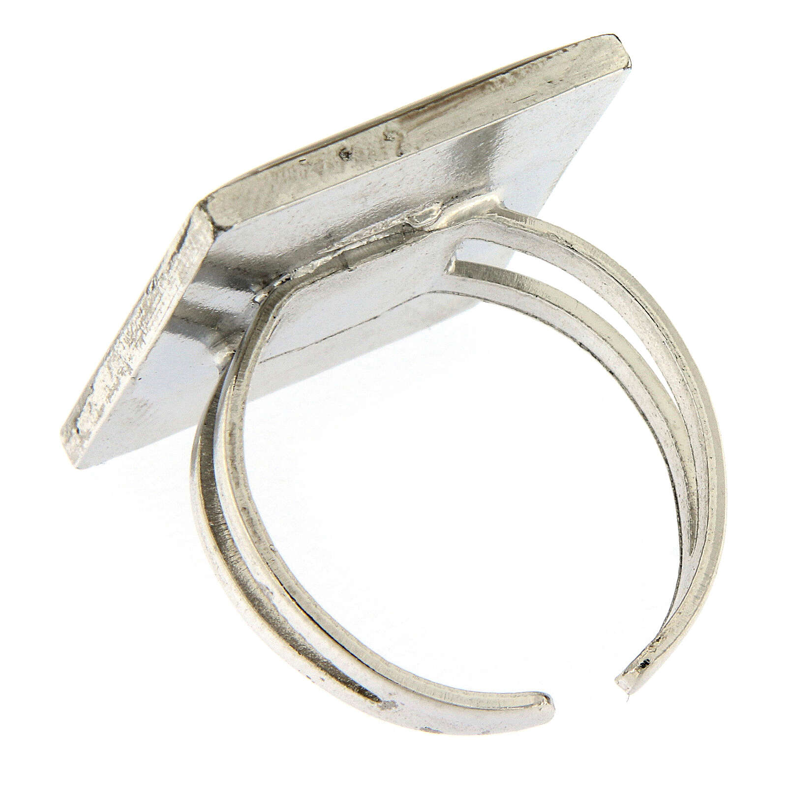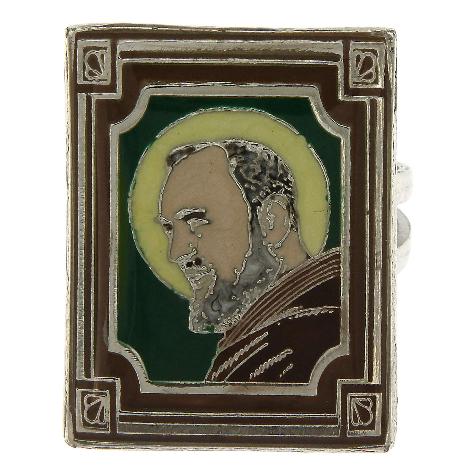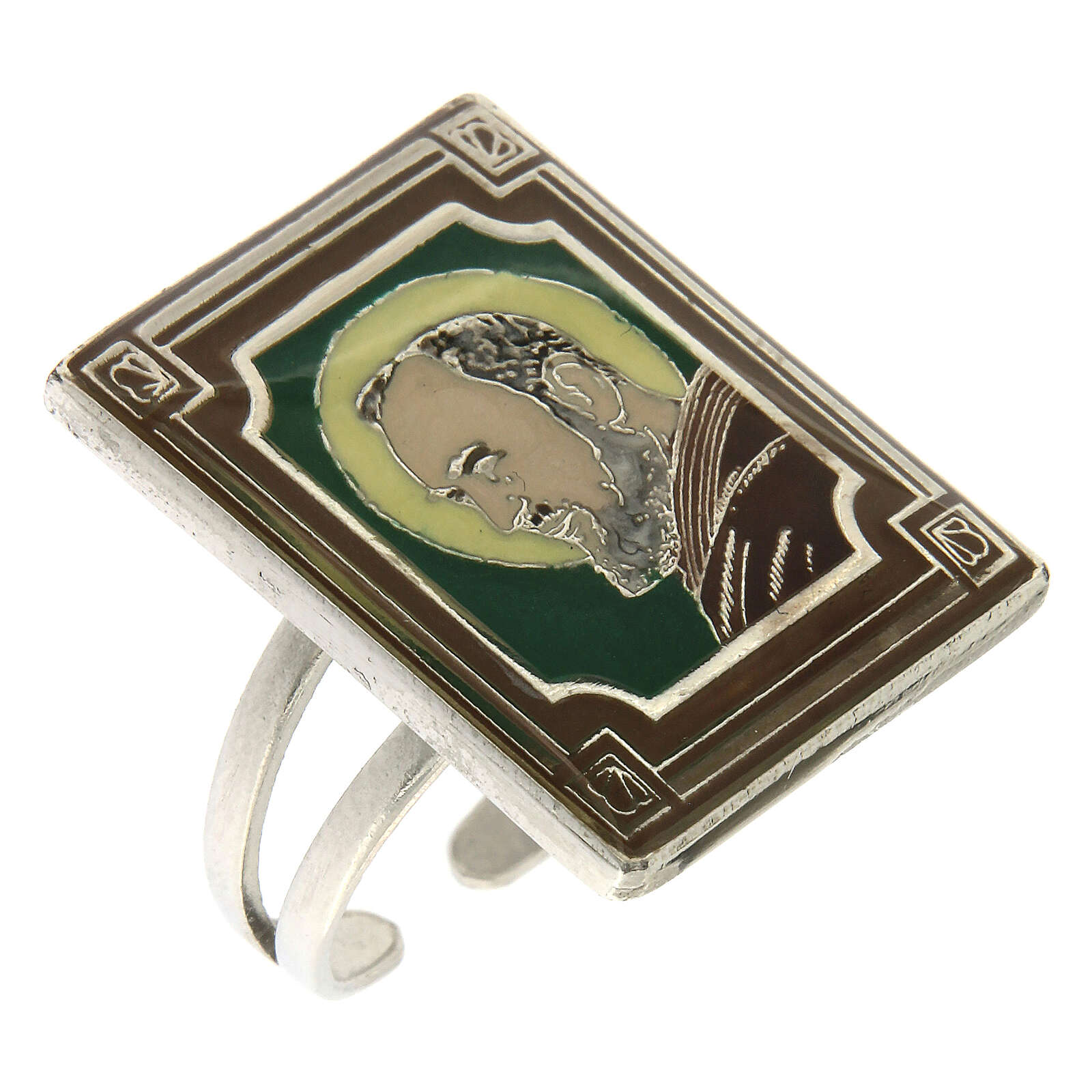 Bague réglable Saint Pio de Pietrelcina vert. Bague représentant Padre Pio sur fond vert émaillé sur une médaille de 2,5x1,9 cm en zamak. L'émail est appliqué à la main par du personnel spécialisé à l'aide d'une seringue dans le but d'offrir une haute définition des détails et protégé par une couche de résine transparente pour un effet encore plus brillant.