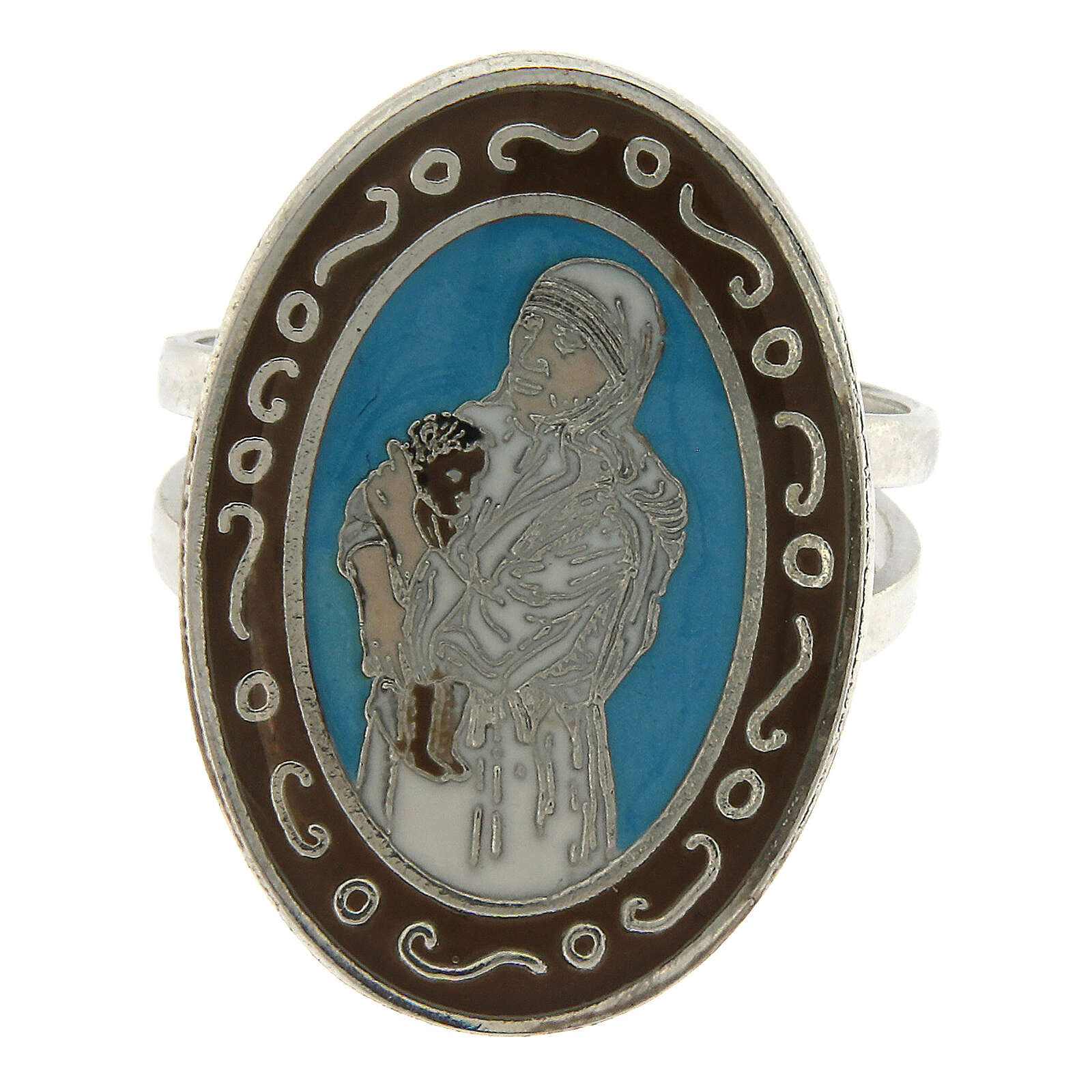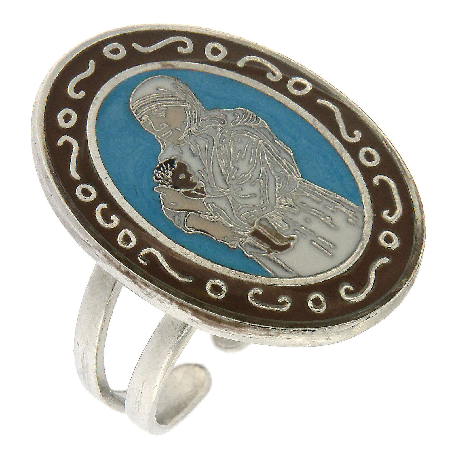 Bague réglable Sainte Teresa de Calcutta émail turquoise. Bague en métal avec médaille en zamak avec finition galvanique en bronze blanc sans nickel. La médaille ovale avec Mère Teresa de 2,5x1,7 cm avec fond turquoise et bord marron est émaillée à la main avec une seringue pour offrir une image très détaillée. L'émail est ensuite cuit et recouvert d'une couche de protection en résine transparente pour en exalter l'éclat.