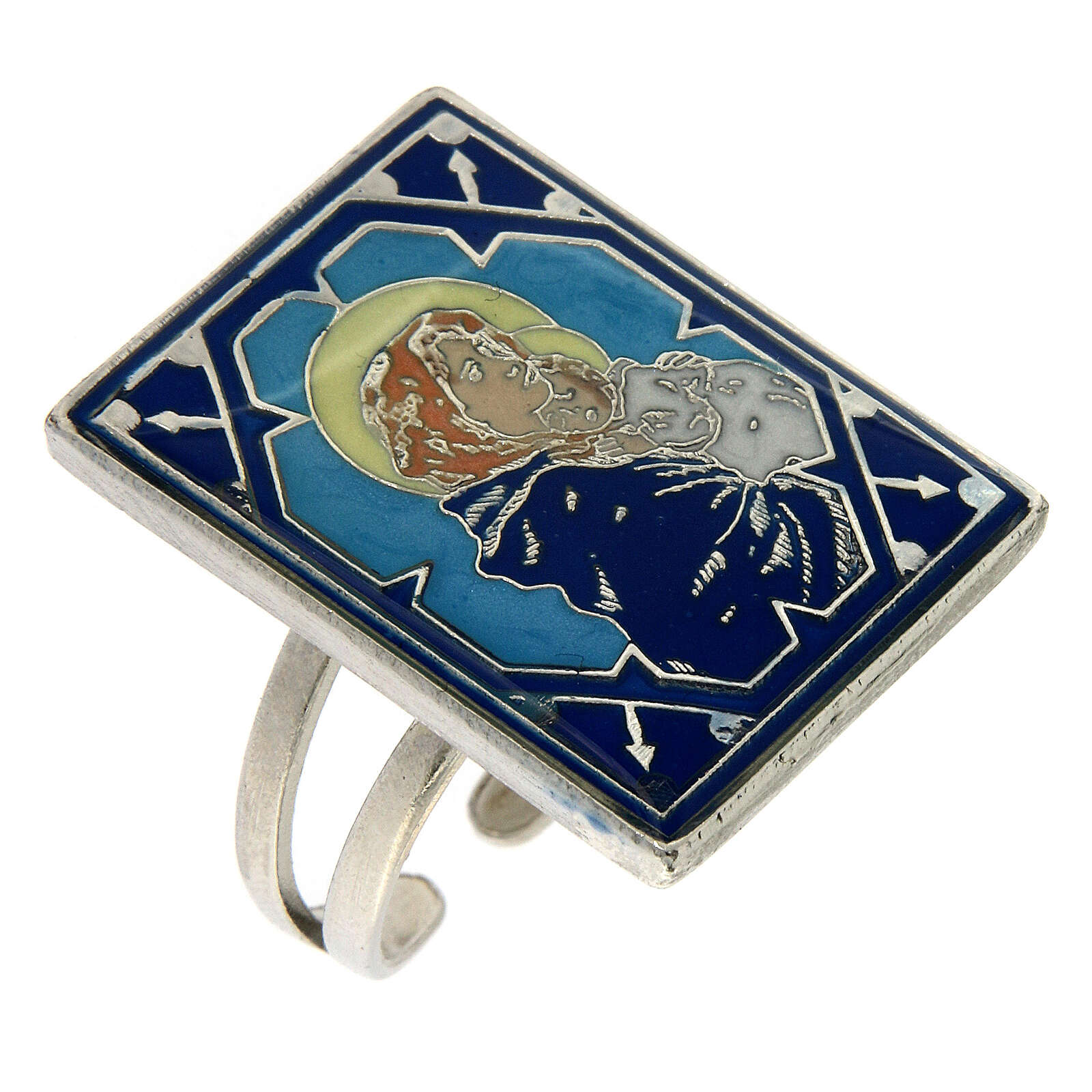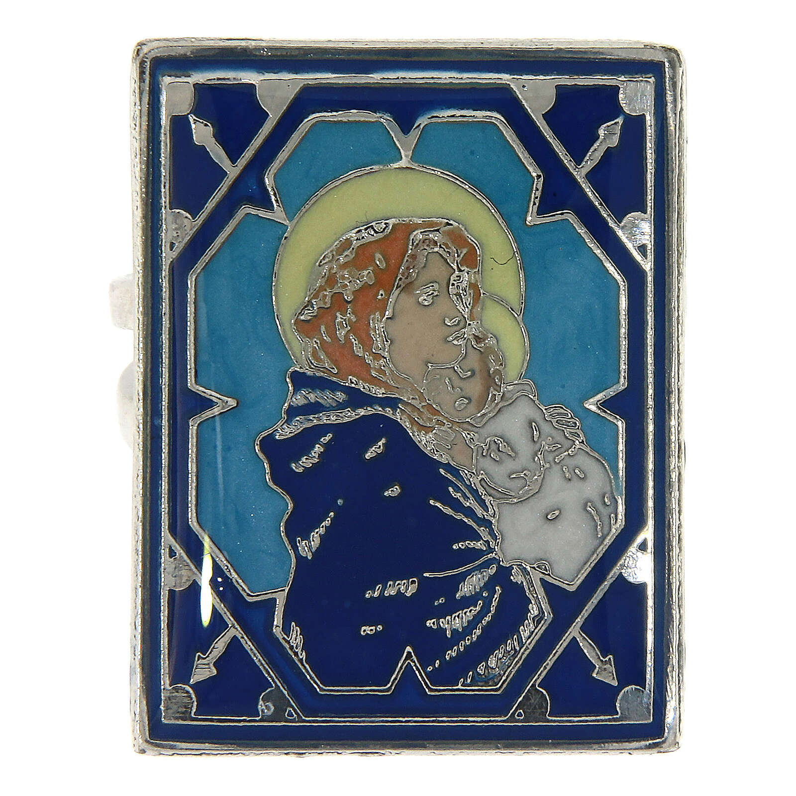 Bague réglable Vierge à l'Enfant émail turquoise. Bague en métal avec médaille en zamak avec finition galvanique en bronze blanc sans nickel. La médaille rectangulaire de la Vierge à l'Enfant de 2,5x1,9 cm avec fond turquoise et bord bleu est émaillée à la main avec une seringue pour offrir une image très détaillée. L'émail est ensuite cuit et recouvert d'une couche de protection en résine transparente pour en exalter l'éclat.