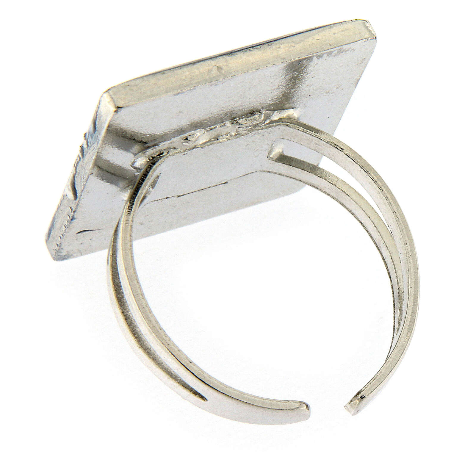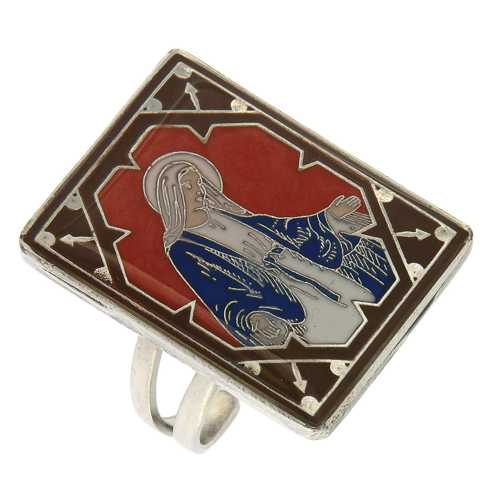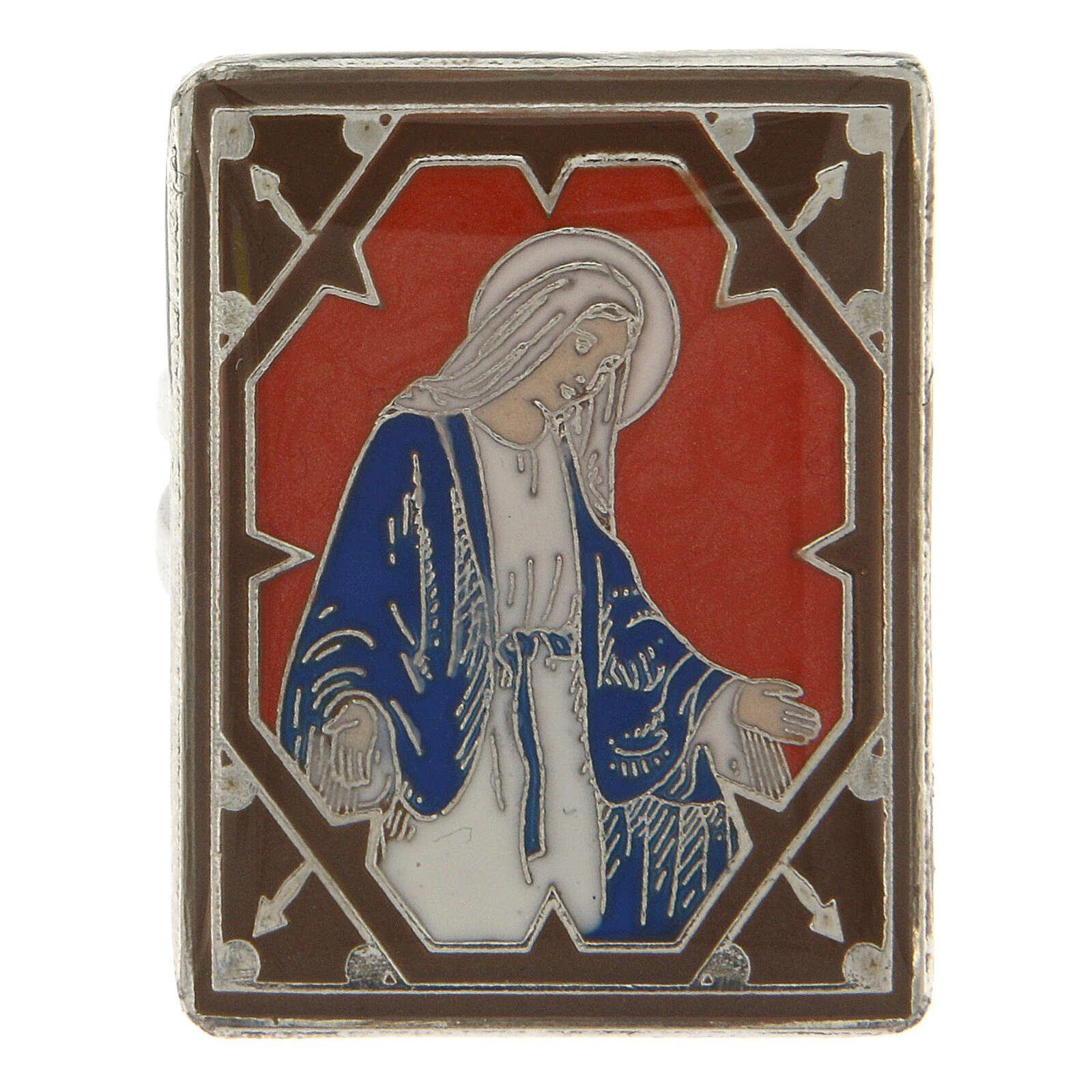 Bague réglable Vierge Miraculeuse émail rouge argentée. Bague en métal avec médaille en zamak avec finition galvanique en bronze blanc sans nickel. La Médaille Miraculeuse de 2,5x1,9 cm avec fond rouge et bord marron est émaillée à la main avec une seringue pour offrir une image très détaillée. L'émail est ensuite cuit et recouvert d'une couche de protection en résine transparente pour en exalter l'éclat.