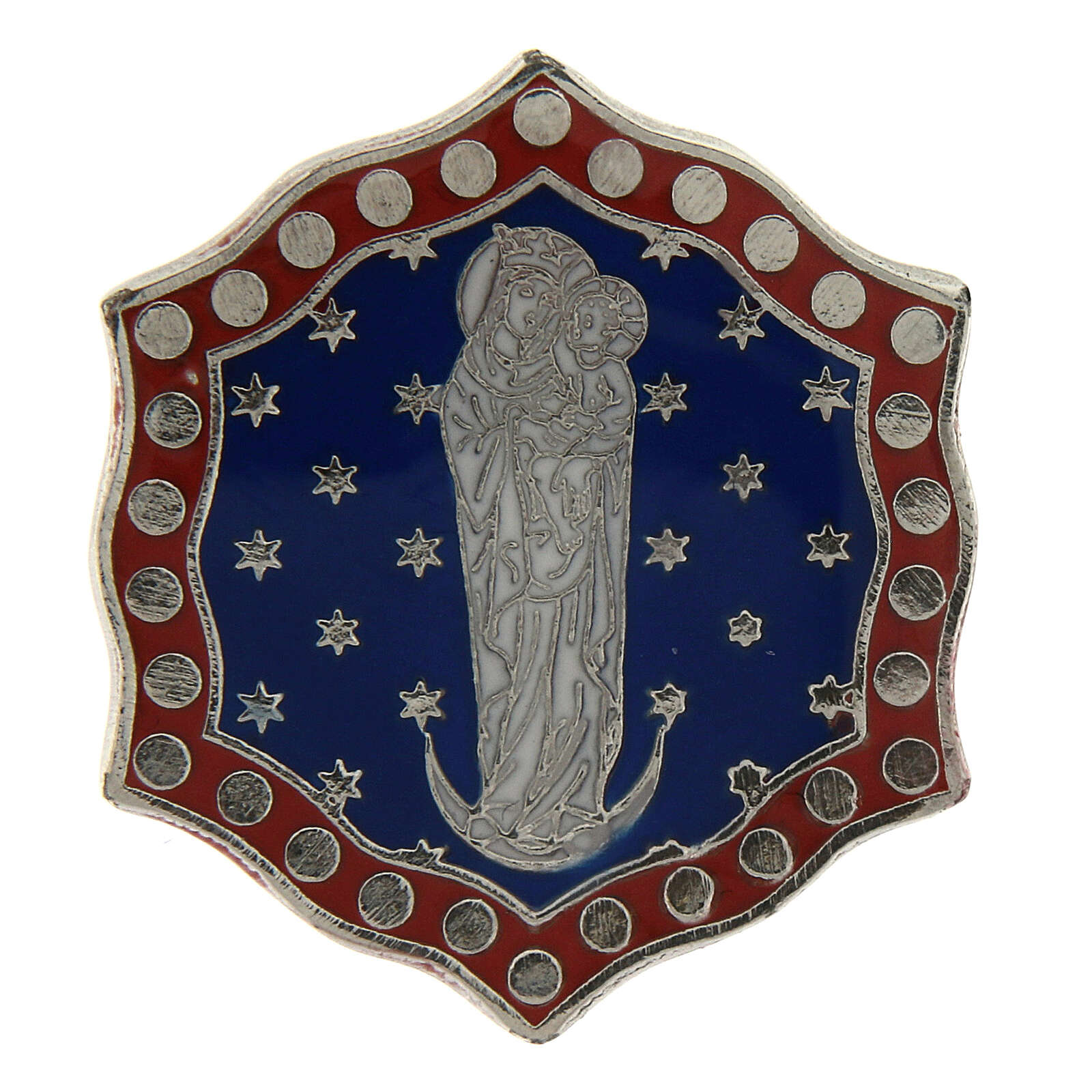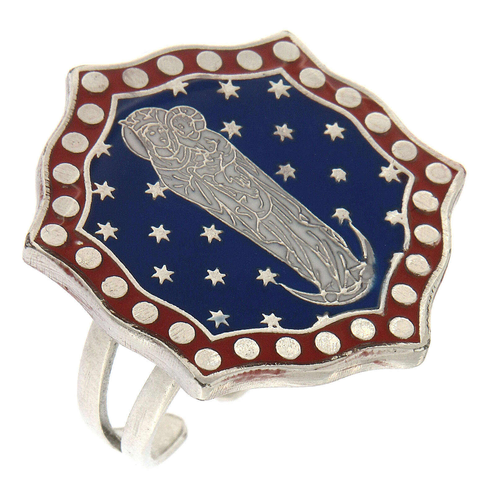 Bague Vierge à l'Enfant demi-lune bleue taille réglable. Bague en métal avec médaille en zamak avec finition galvanique en bronze blanc sans nickel. La médaille hexagonale avec Vierge à l'Enfant dans ciel étoile avec demi-lune de 2,5x2,7 cm avec fond bleu est émaillée à la main avec une seringue pour offrir une image très détaillée. L'émail est ensuite cuit et recouvert d'une couche de protection en résine transparente pour en mettre en valeur l'éclat.