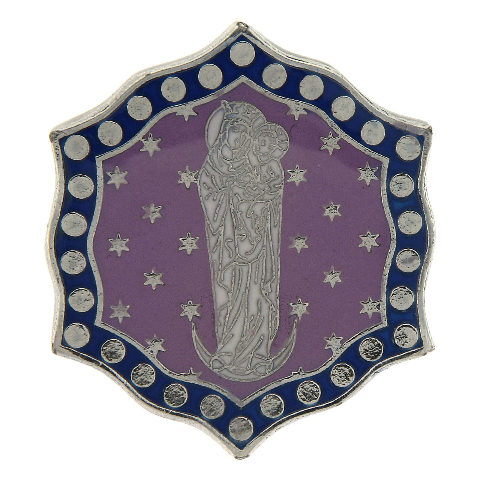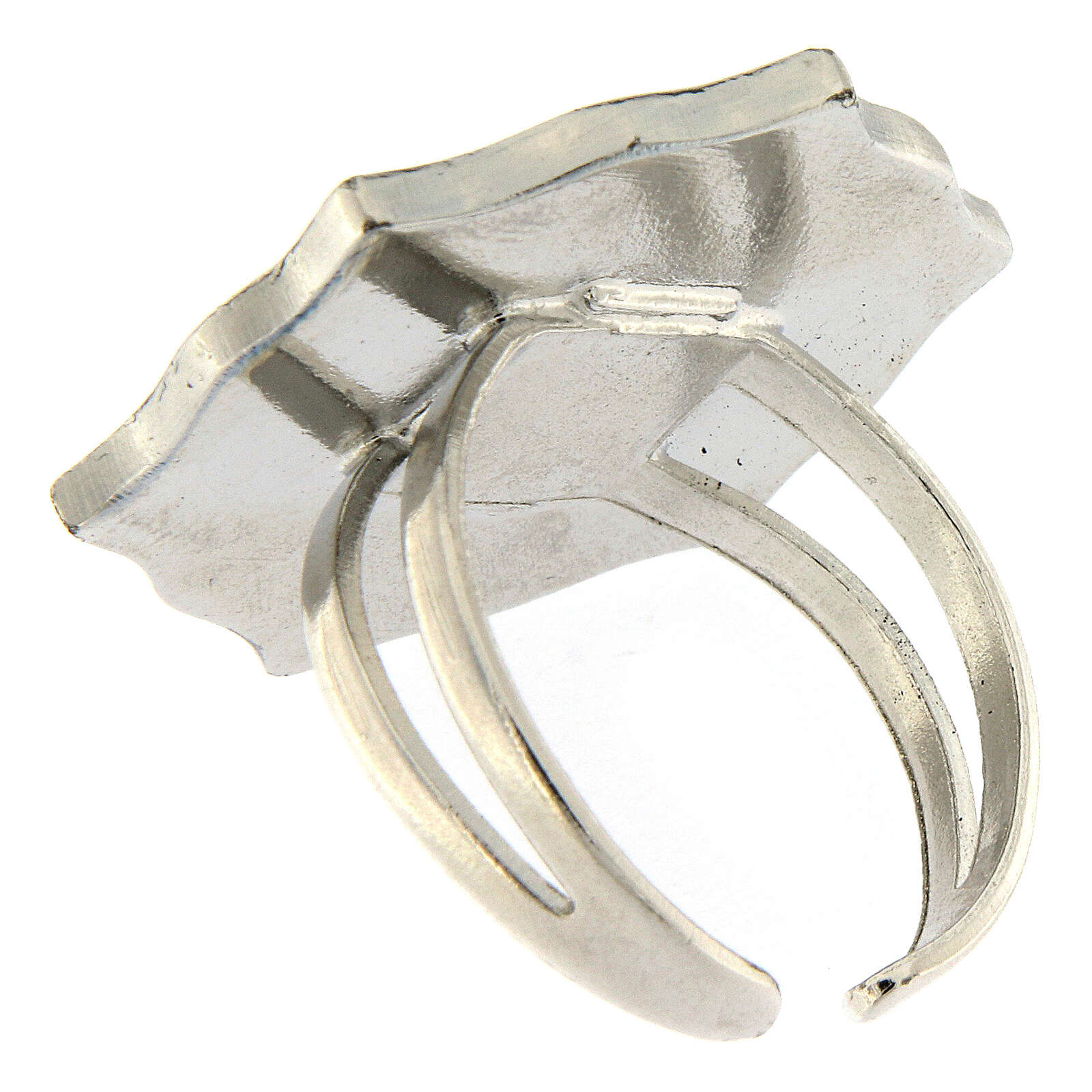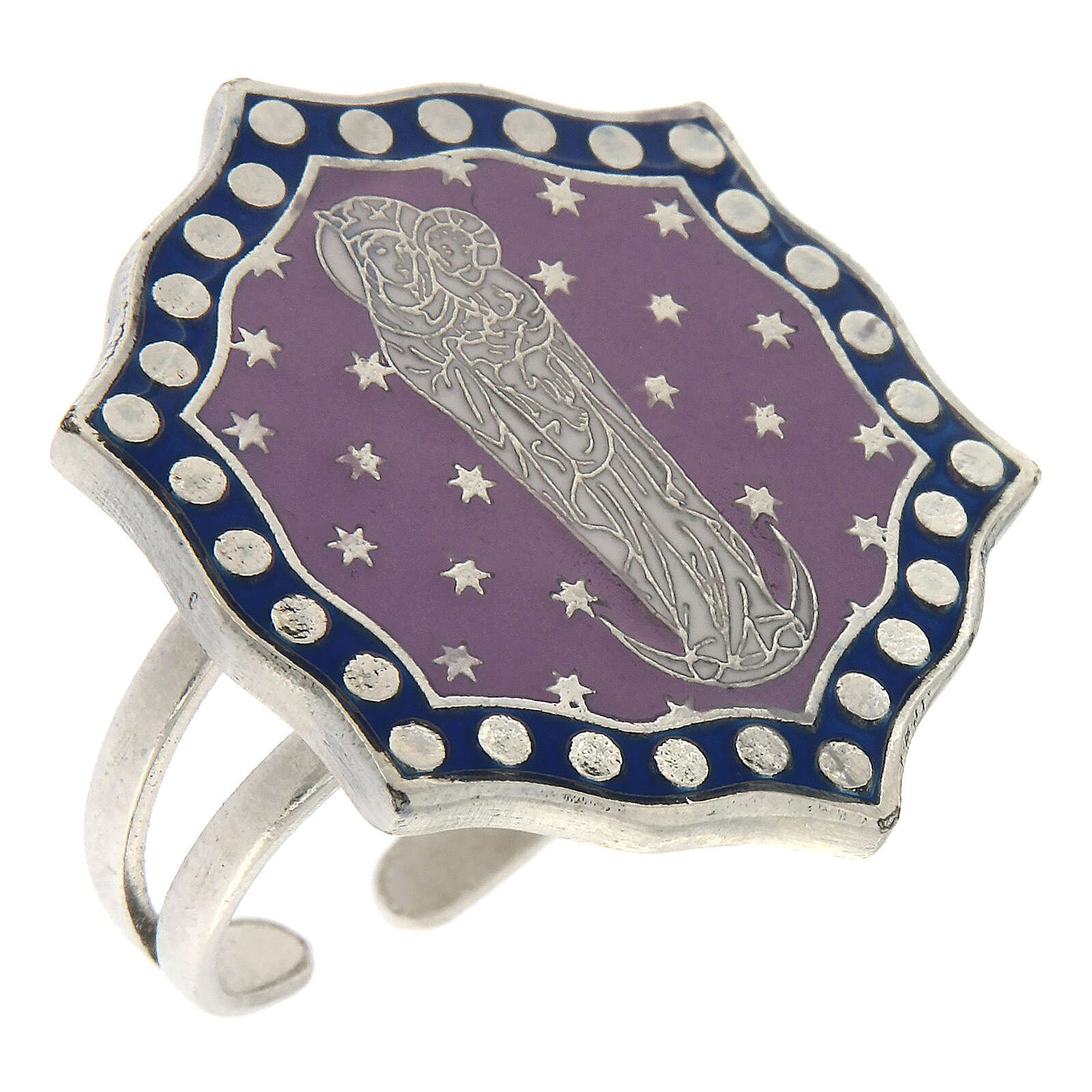Bague Vierge à l'Enfant demi-lune lilas taille réglable. Bague en métal avec médaille en zamak avec finition galvanique en bronze blanc sans nickel. La médaille hexagonale avec Vierge à l'Enfant dans ciel étoile avec demi-lune de 2,5x2,7 cm avec fond lilas est émaillée à la main avec une seringue pour offrir une image très détaillée. L'émail est ensuite cuit et recouvert d'une couche de protection en résine transparente pour en mettre en valeur l'éclat.
