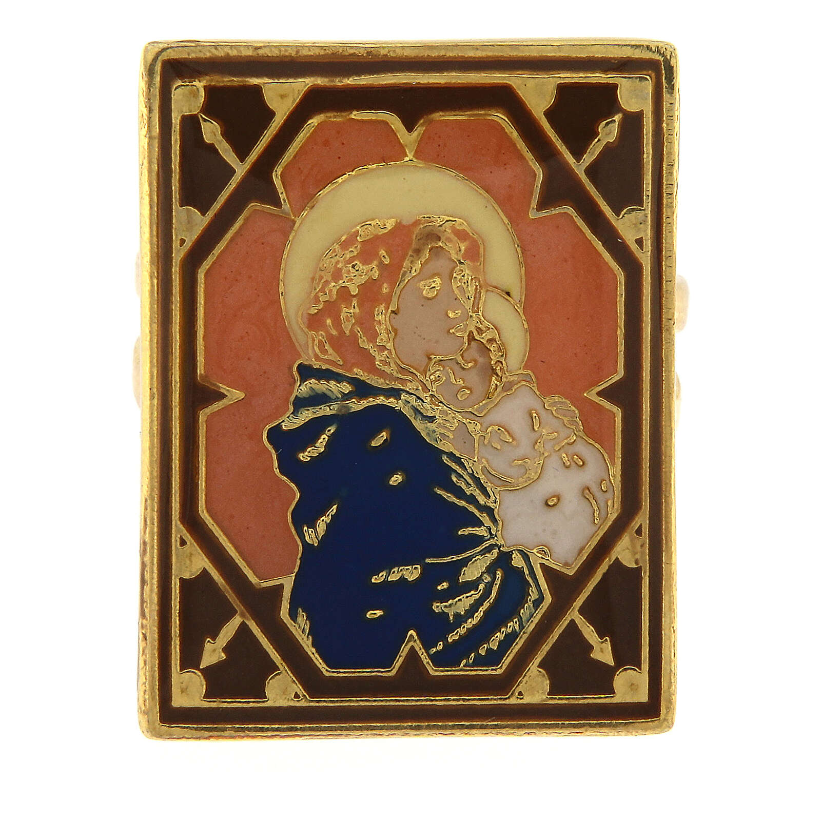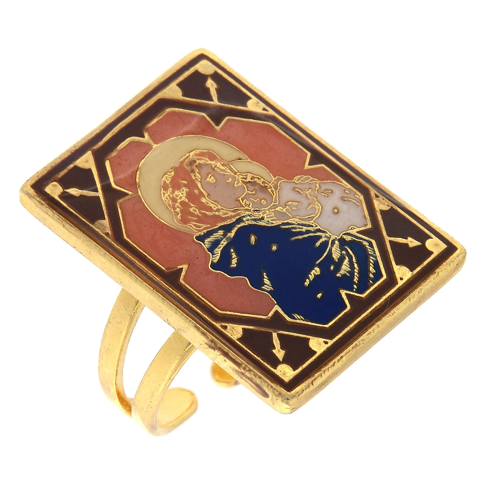 Bague Vierge à l'Enfant émail orange réglable. Bague réglable de 15 à 18 mm (diamètre interne de départ : 17 mm) en métal avec finition galvanique doré sans nickel complété par une médaille en zamak de 2,5x1,9 cm. Cette dernière représente la Vierge à l'Enfant émaillée à la main sur un fond orange.