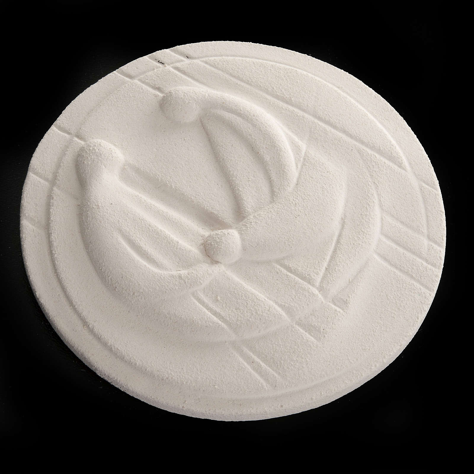 Bas relief rond en argile réfractaire qui reproduise la Nativité de Jésus. Bas relief réalisé à la main en Italie en argile réfractaire blanche. L'argile est moulée à la main et après cuite à plus de 1000°C. Le travail et la décoration de ce bas relief sont complètement réalisés à la main pour lui donner des lignes agréables et élégantes. Produit d'haute qualité de l'atelier Ave de Loppiano (Florance).