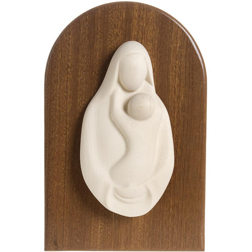Bas-relief de la Vierge Marie avec enfant sur planche de bois de cerisier. Réalisé et taillé sur bois, très élégante et délicate.