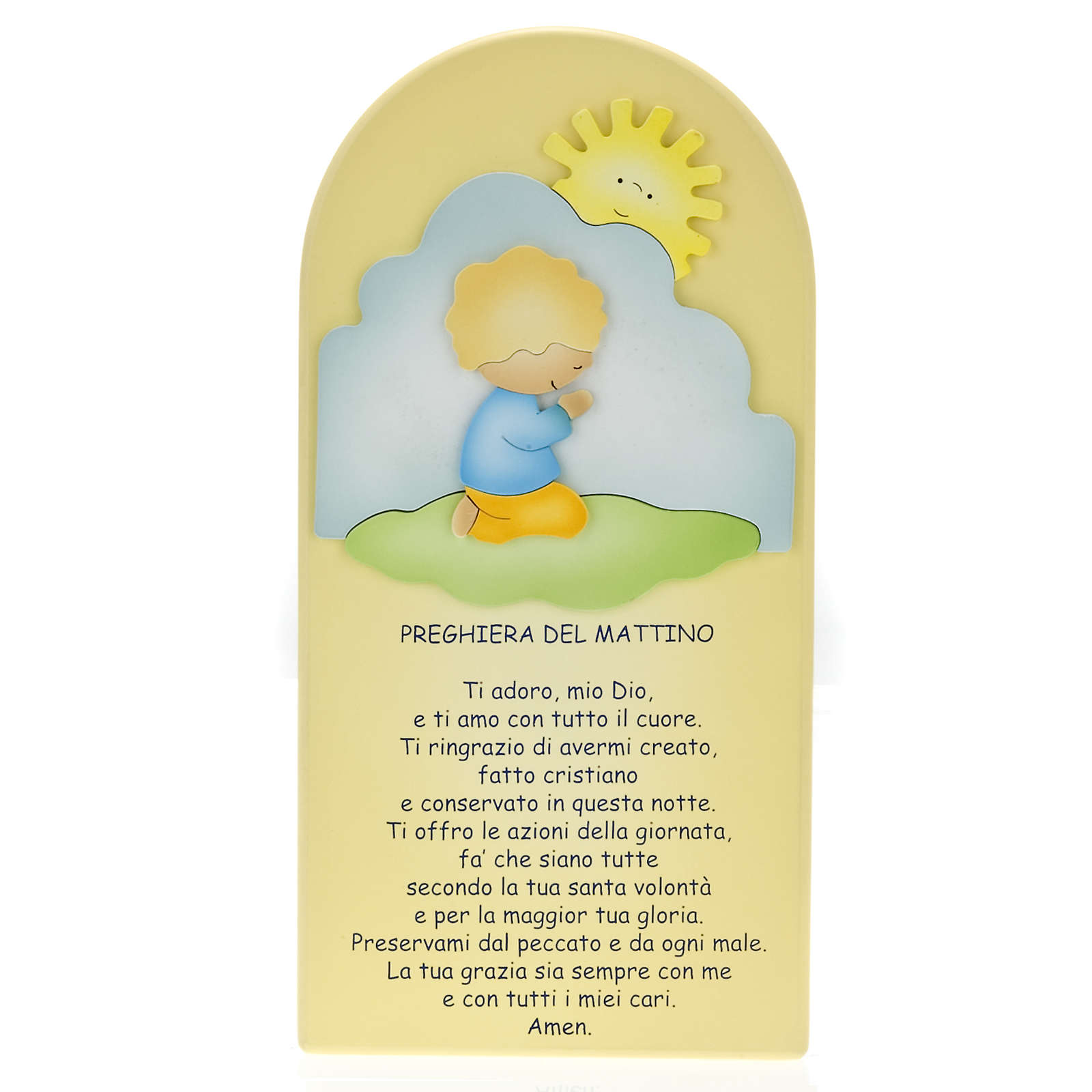Disponibilité immédiate Cadre religieux prière du matin. Cadre en bois avec enfant et Prière du Matin écrite en Italien. Belle idée cadeaux pour baptême, fêtes ou anniversaire et comme décoration pour la chambre des enfants. Cadre religieux à accrocher au mur.