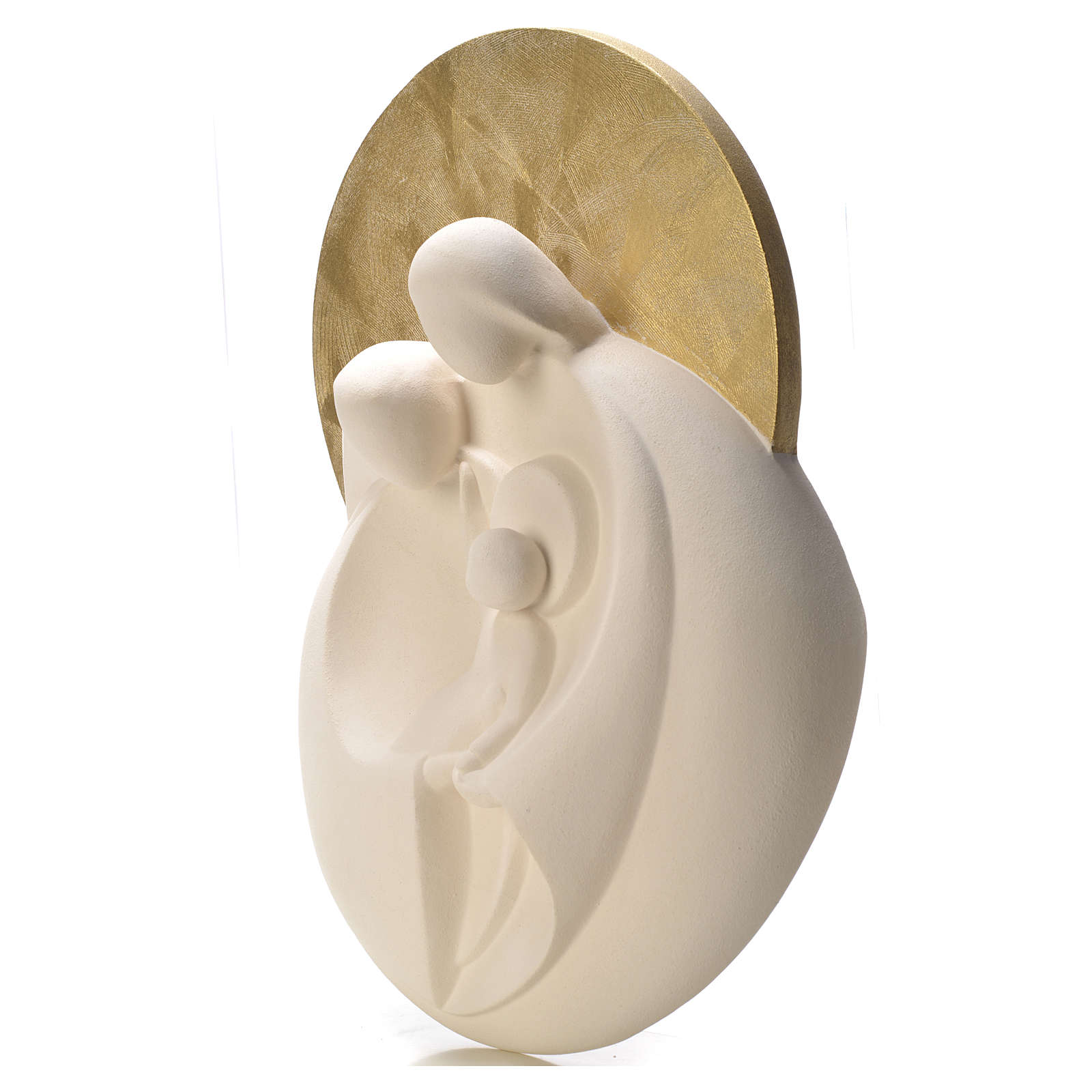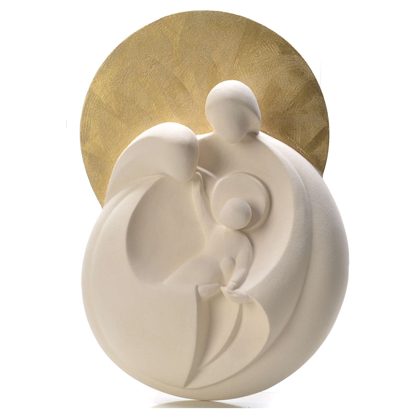 Sainte Famille Aurora Gold argile réfractaire. Composition stylisée représentant la Sainte Famille en argile réfractaire blanche, travaillée par moulage et cuite à plus de 900°. La finition de cette statuette est entièrement réalisée à la main pour lui conférer des lignes agréables, sobres et élégantes.