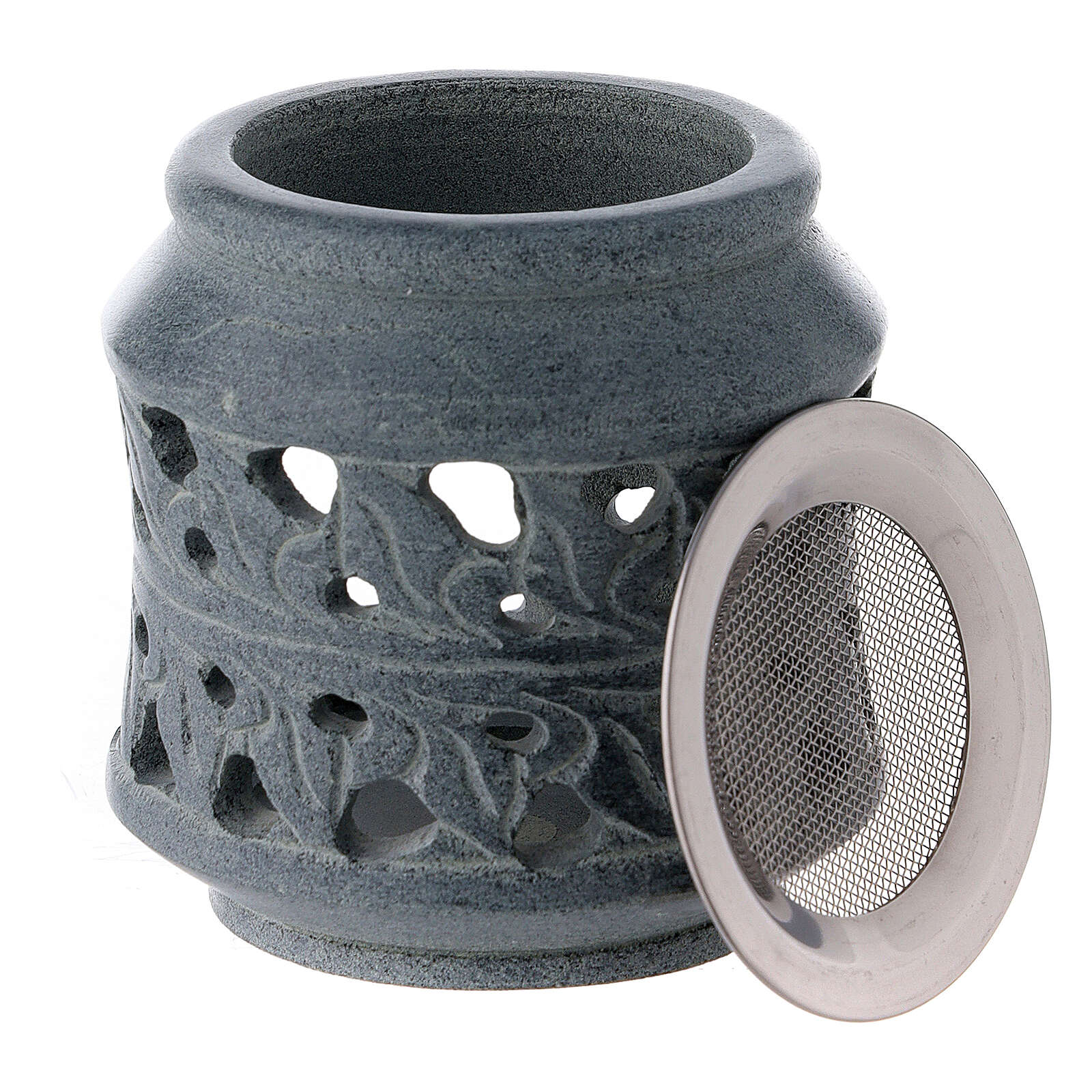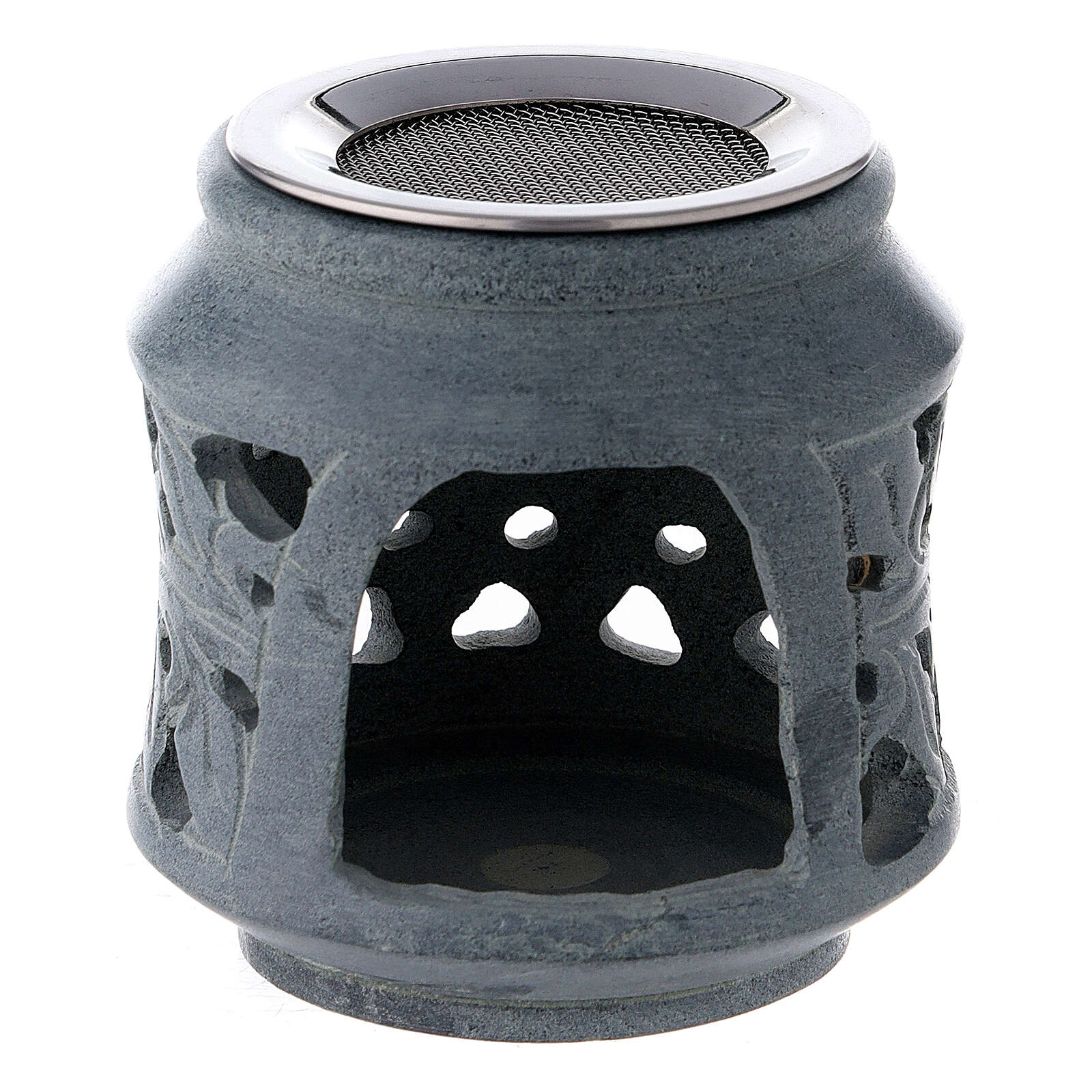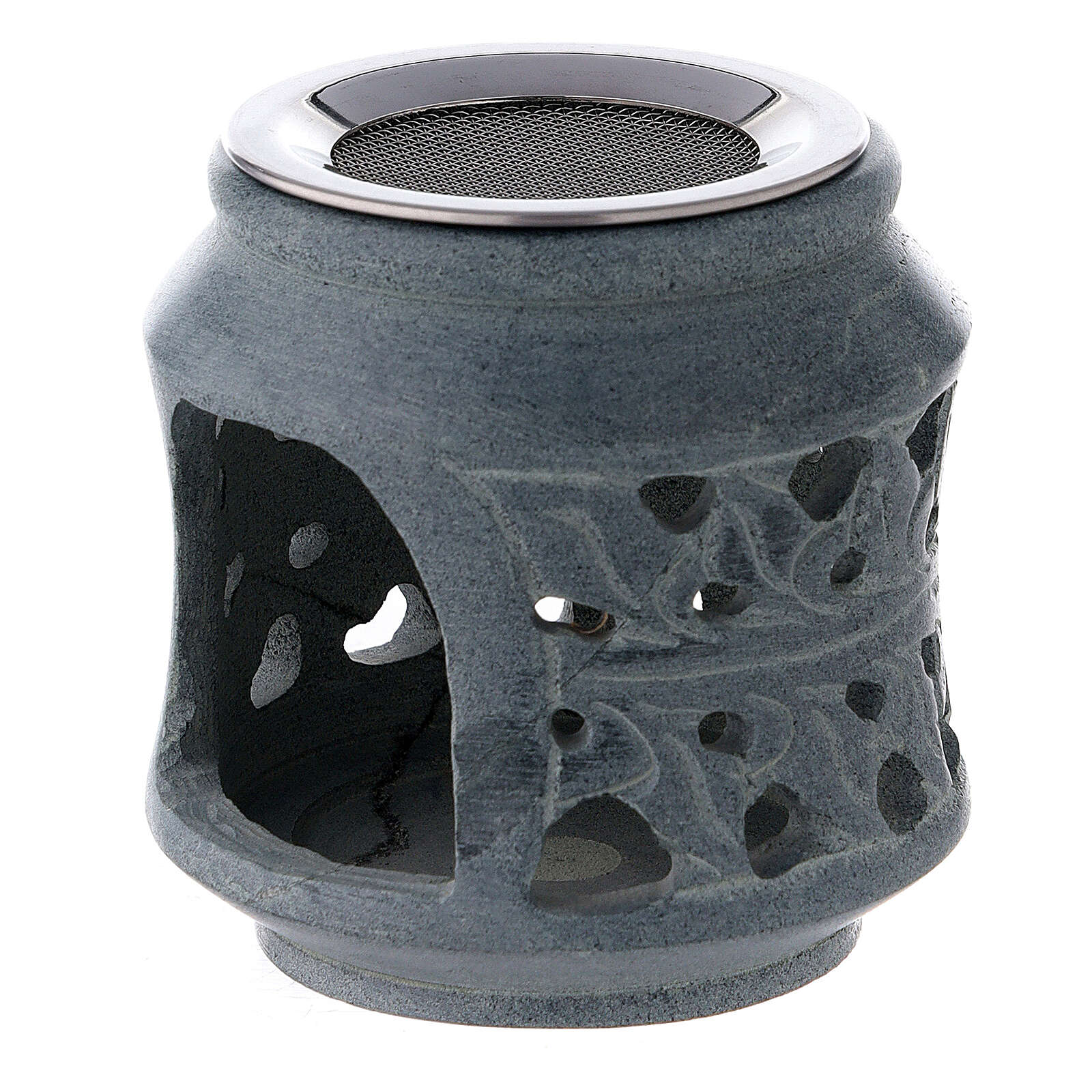 Brûle-encens décorations doubles stéatite noire 8 cm. Brûle-encens avec décoration gravée et ajourée de feuilles tressées sur deux bandes. La base accueille un emplacement pour bougie et la partie supérieure un fourneau pour charbon.Le matériau choisi, 100% naturel, rend chaque pièce différente et unique.Hauteur : 8 cm.