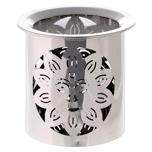 Brûle-encens en acier ajouré avec soleil h 8 cm finition brillante. Brûle-encens en acier brillant, de forme cylindrique, avec base pour bougie chauffe-plat de 8 cm et filet pour encens, décoré d'un soleil souriant ajouré.