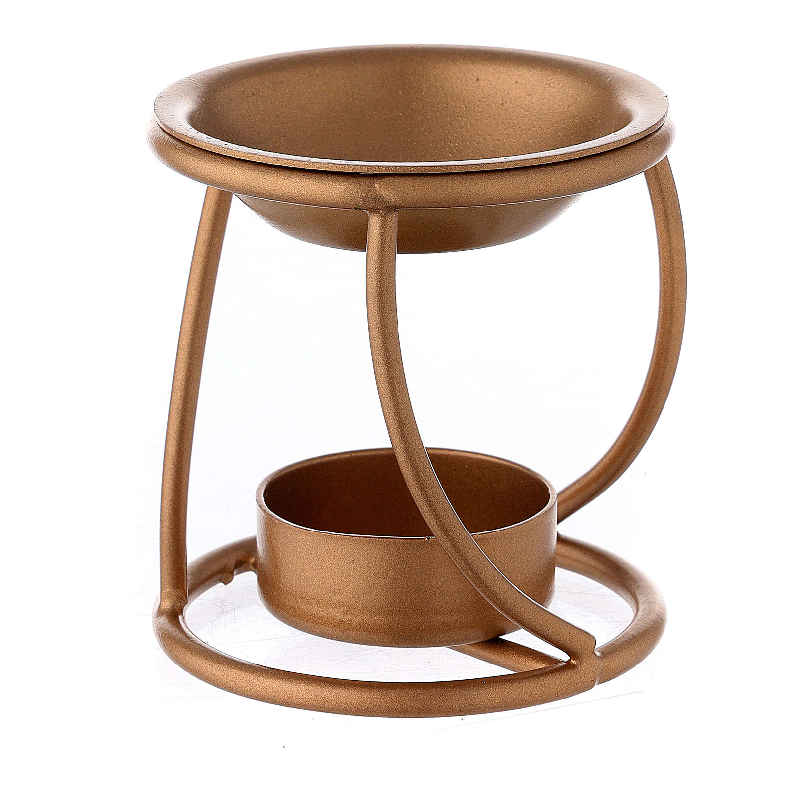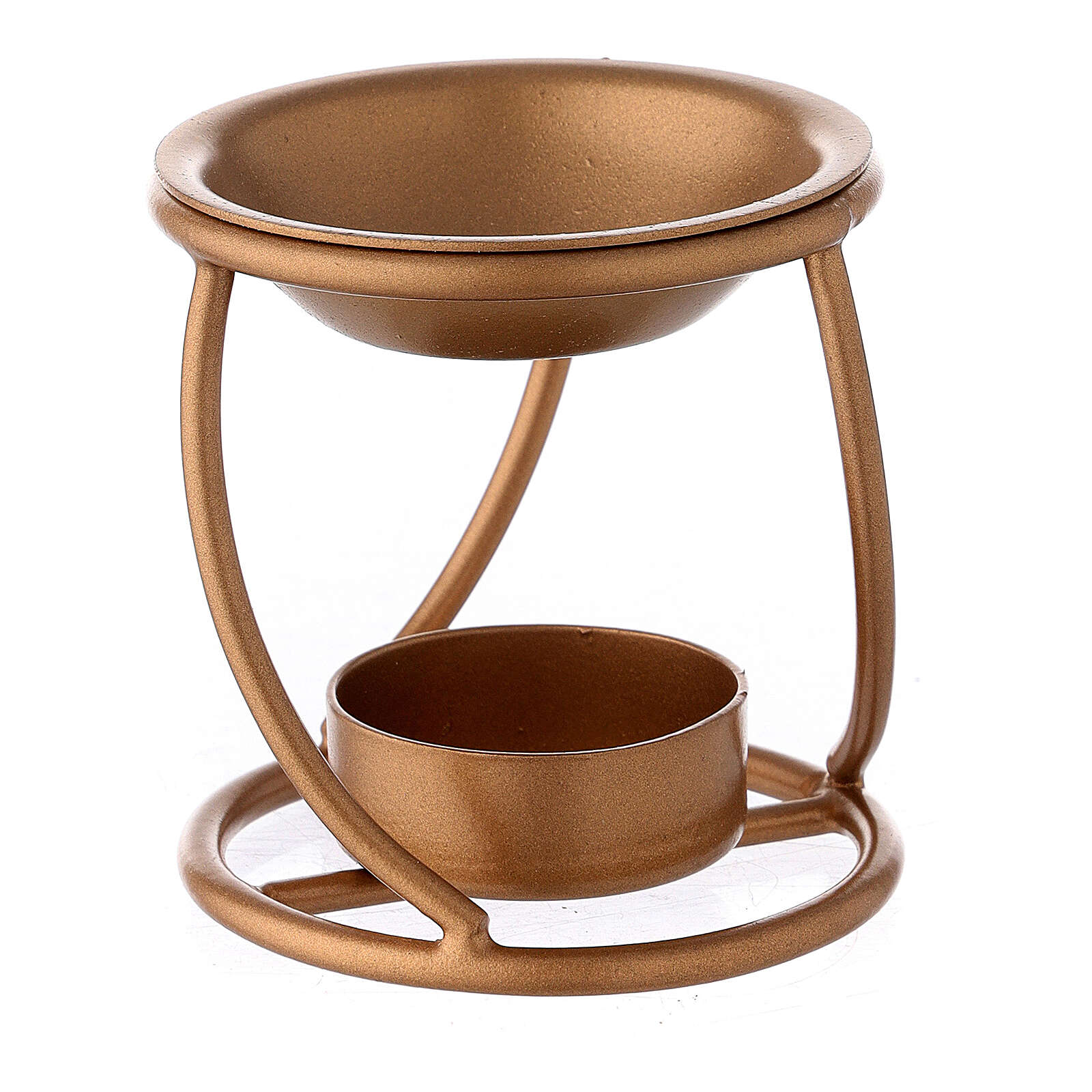 Brûle-encens métal doré spirale bougie 7 cm. Brûle-encens en métal verni couleur or métallisé mat de 7 cm de hauteur avec base pour bougie chauffe-plat et fourneau pour encens soutenu par une structure en spirale.