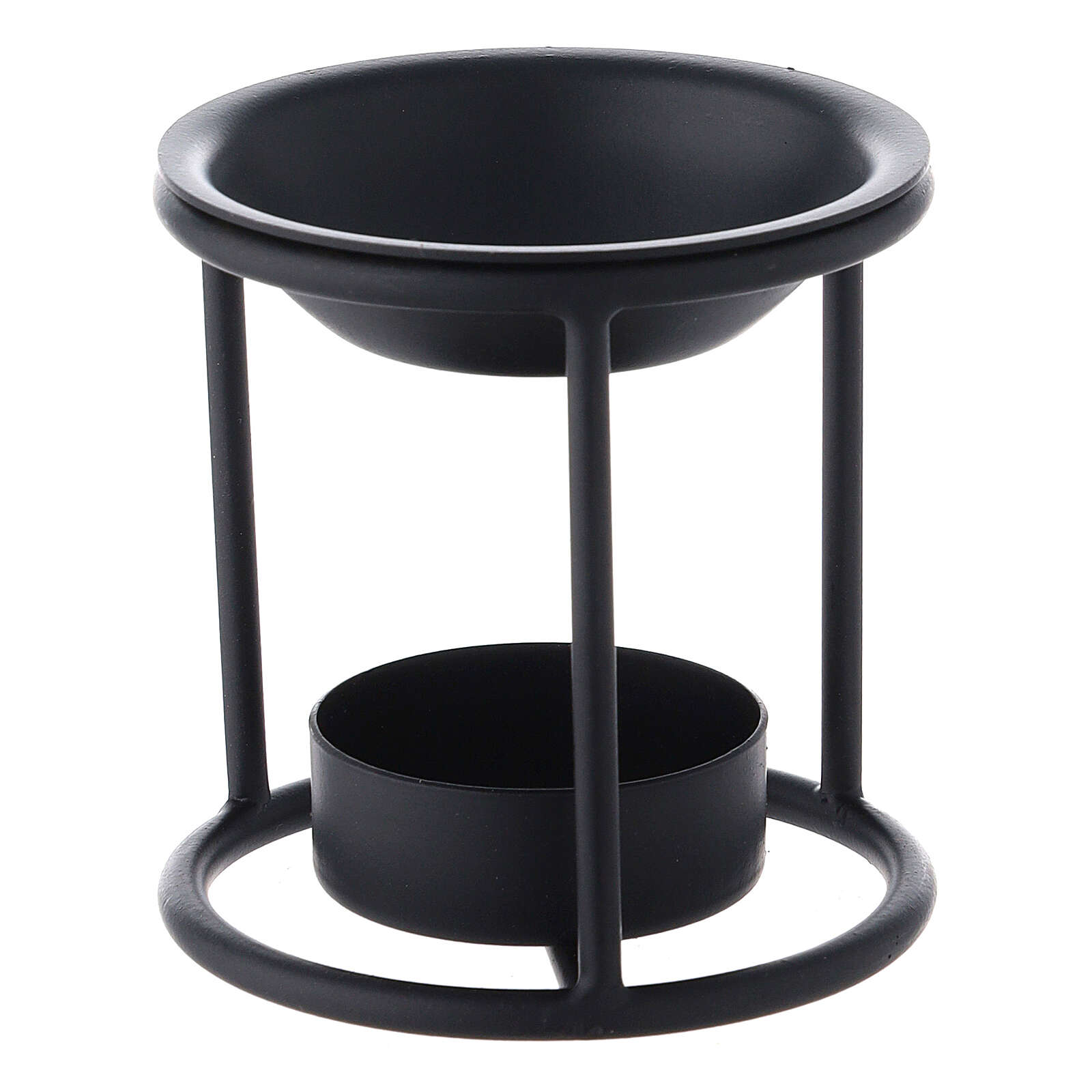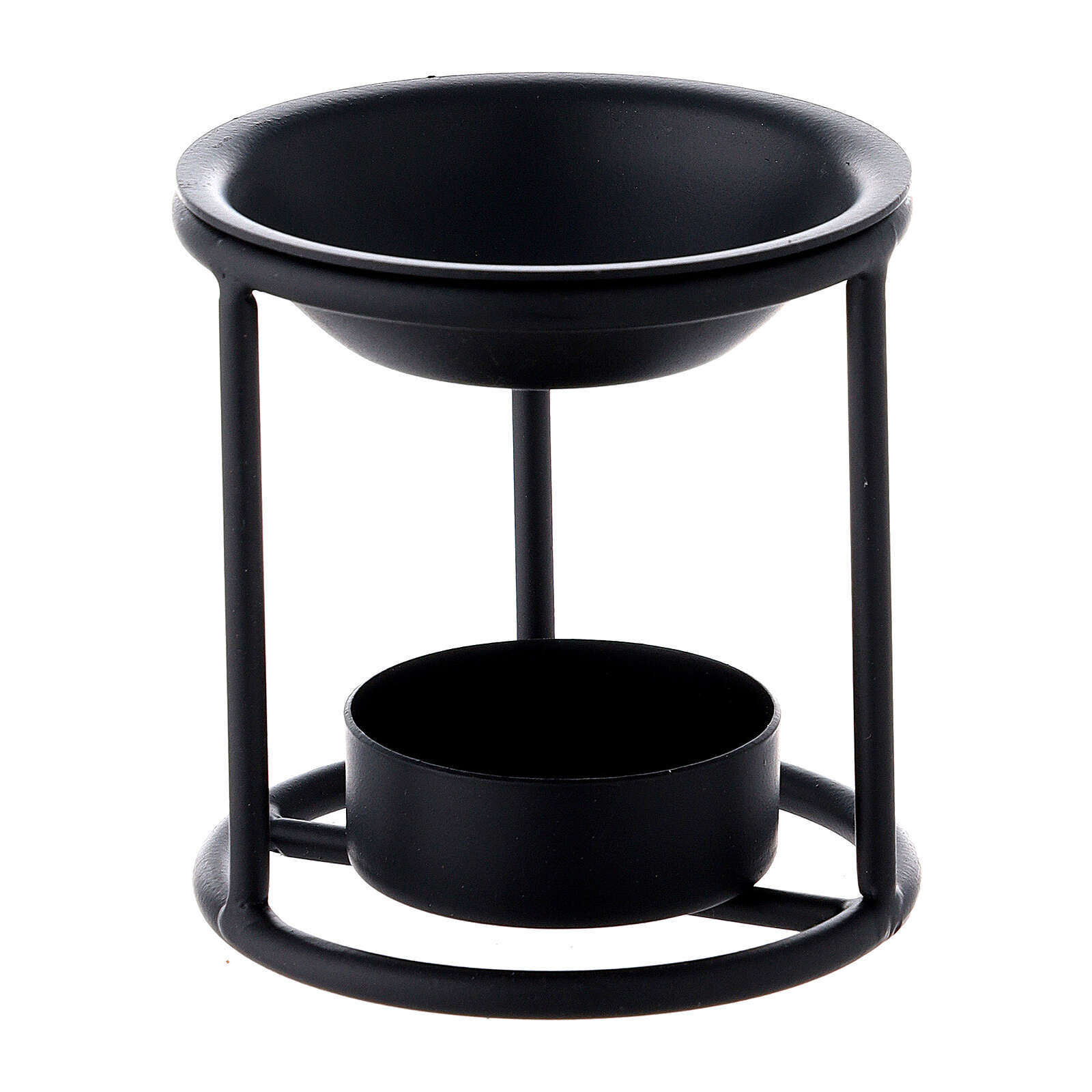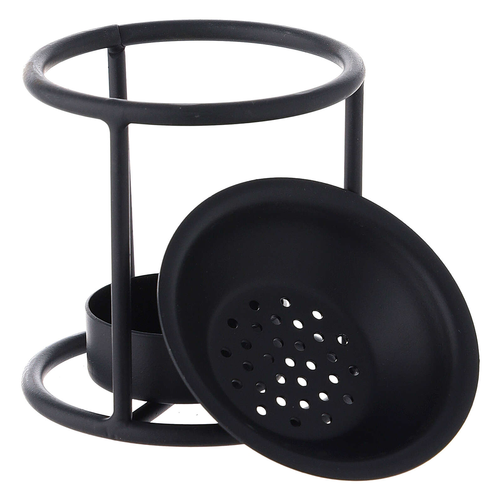 Brûle-encens métal noir bougie 7 cm. Brûle-encens à bougie composé d'une base pour bougie chauffe-plat et d'un fourneau pour charbon, supportés par une structure cylindrique réalisée en métal peint noir mat.