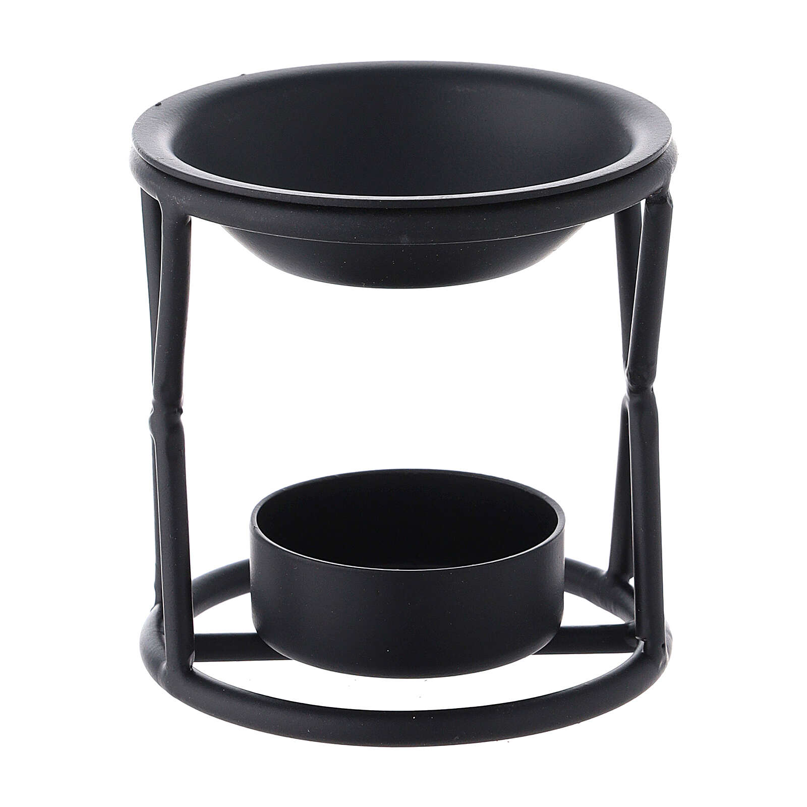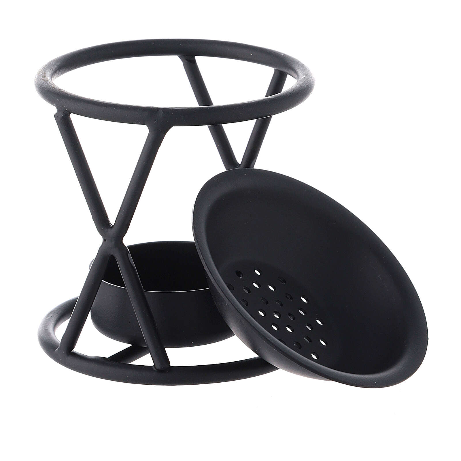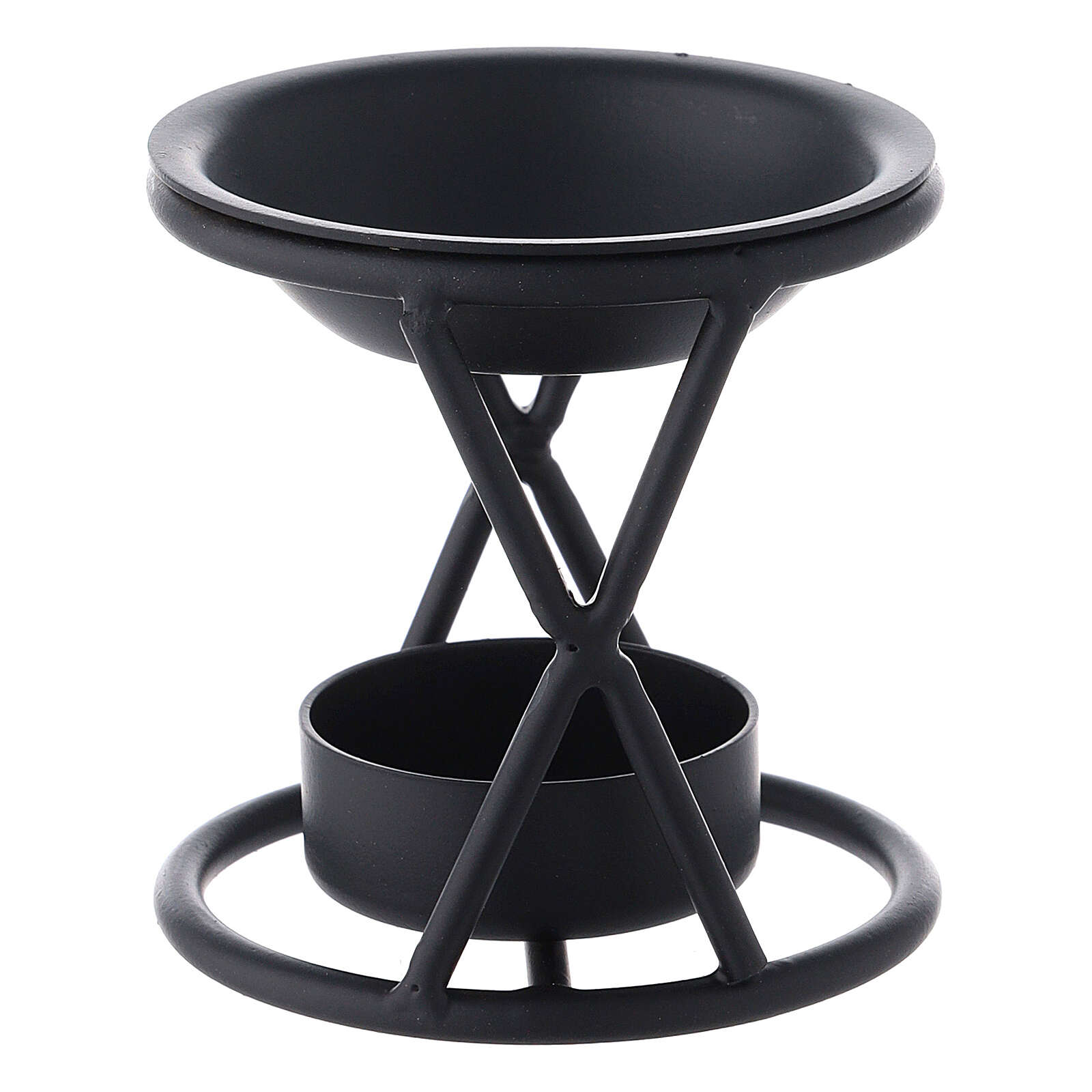 Brûle-encens métal noir X hauteur 7 cm. Brûle-encens avec structure en X réalisé en métal verni en noir mat de 7 cm de hauteur avec base pour bougie et bol pour encens.