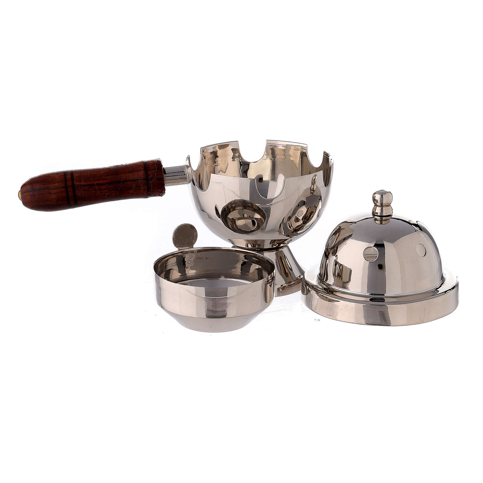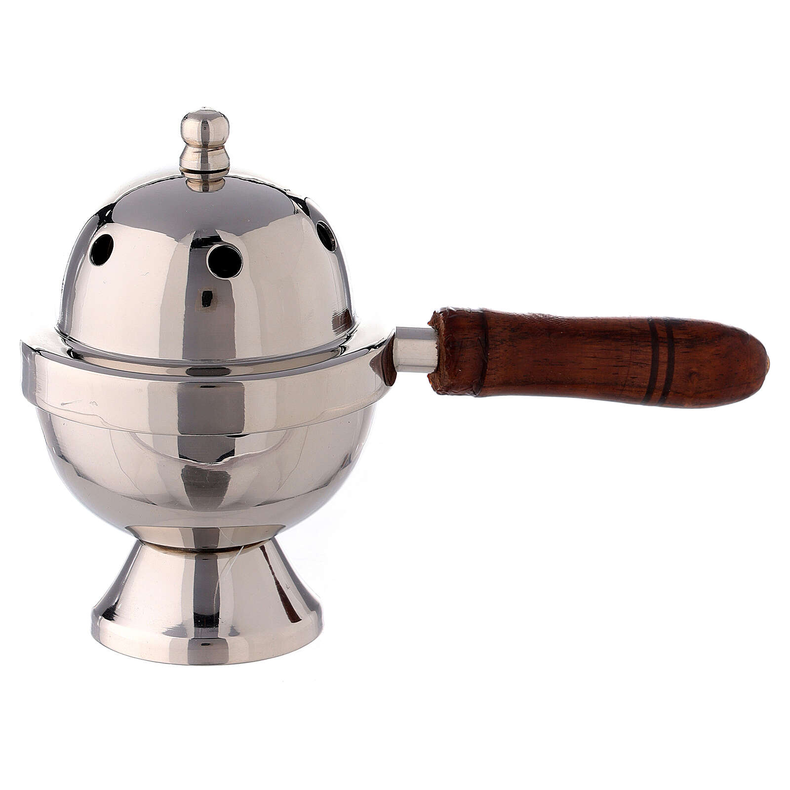 Brûle-encens ovale manche bois laiton nickelé 15 cm. Brûle-encens de forme ovale avec couvercle aux ouvertures circulaires pour la fumée et base avec manche en bois de 15 cm de longueur, réalisé à la main en bois et laiton nickelé brillant.
