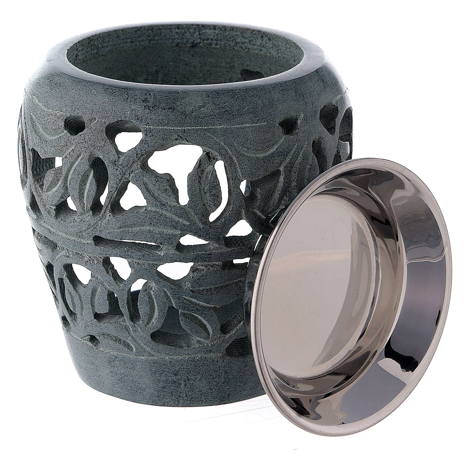 Brûle-encens pierre ollaire foncée 8 cm ajouré. Brûle-encens en pierre ollaire foncée, résistante à la chaleur, avec extérieur délicatement gravé et ajouré à former des images naturalistes. La base accueille un emplacement pour bougie et la partie supérieure un fourneau pour charbon.Le matériau choisi, 100% naturel, rend chaque pièce différente et unique.Hauteur : 8 cm.
