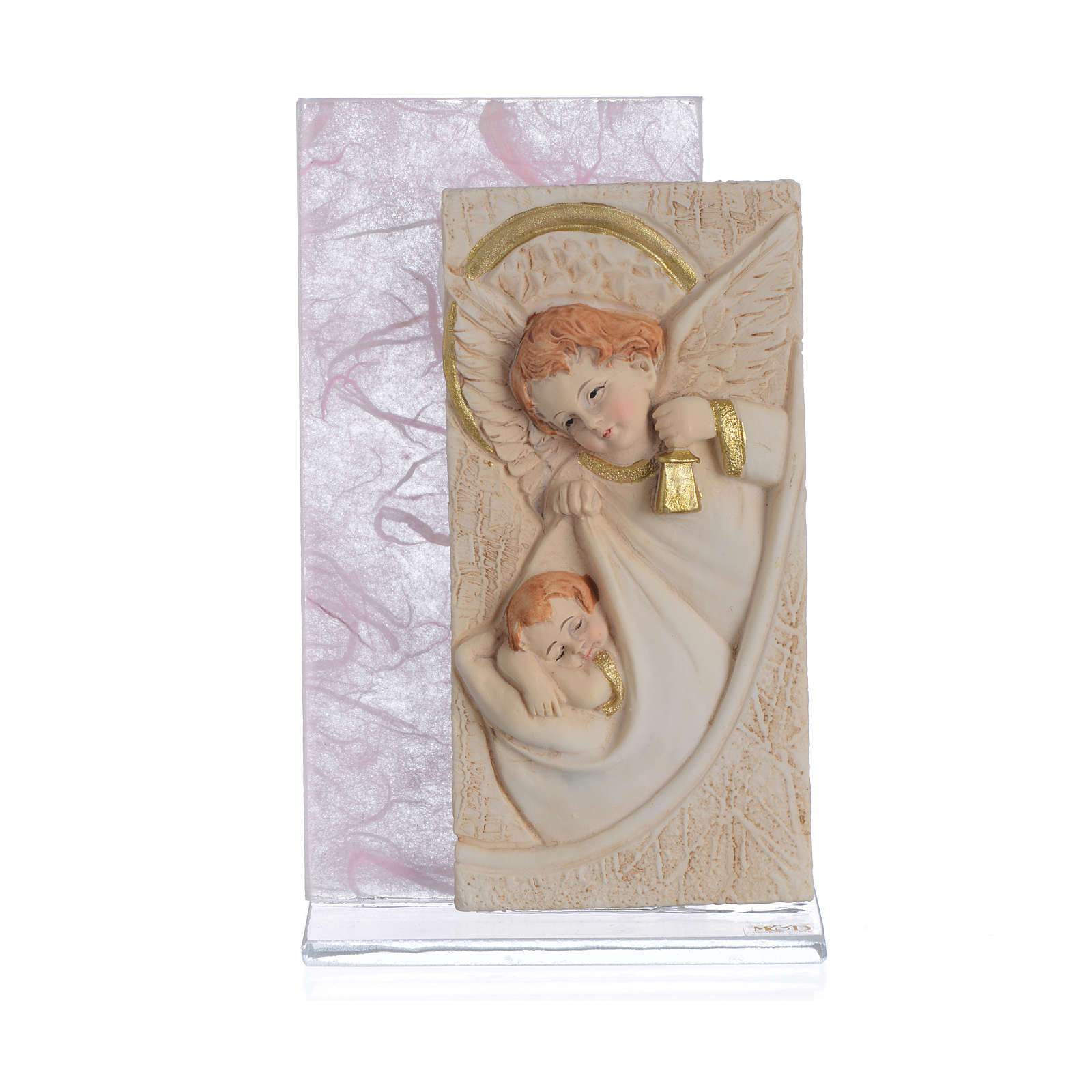 Disponibilité immédiate Cadre Ange papier soie rose h 11,5 cm. Petit cadre en poudre de marbre avec image en relief sur plaque en verre et application de papier de soie.