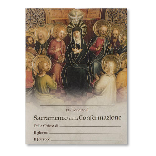Diplôme souvenir de la Confirmation, imprimé en italien par Fratelli Bonella sur vrai parchemin représentant la descente du Saint-Esprit sur Marie, entourée par les apôtres.