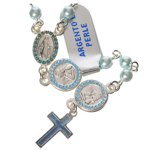 Chapelet argent 800 perles bleu Ange Gardien. Chapelet avec fermoir en argent 800 et perles couleur bleu, entièrement réalisé en Italie par des artisans expérimentés. Les Notre Père sont marqués avec des médailles représentant l'Ange Gardien.