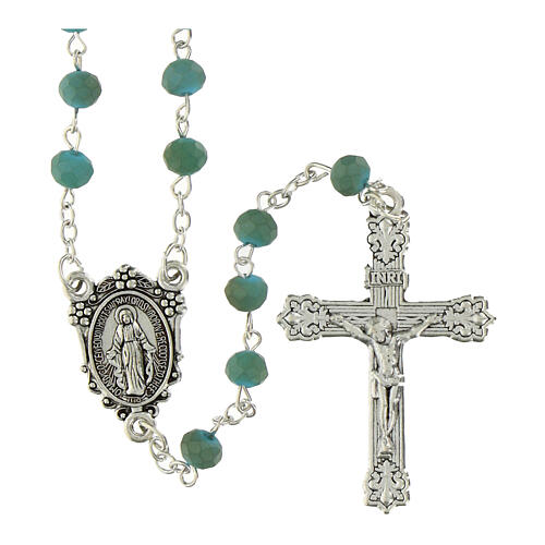 Chapelet collier de 61 cm de circonférence avec grains en cristal bleu mat de 6x4 mm, médaille métallique représentant Notre-Dame des Grâces et crucifix décoré en métal de 4,5x3 cm.