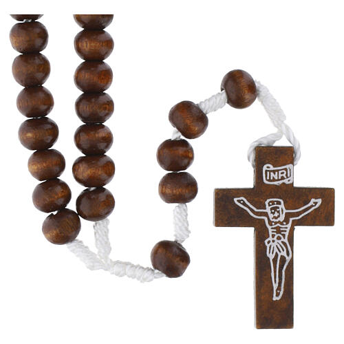 Chapelet franciscain avec grains en bois clair. Réalisé à la main et les dizaines sont séparées par des petits noeuds et la croix représente Jésus Christ.