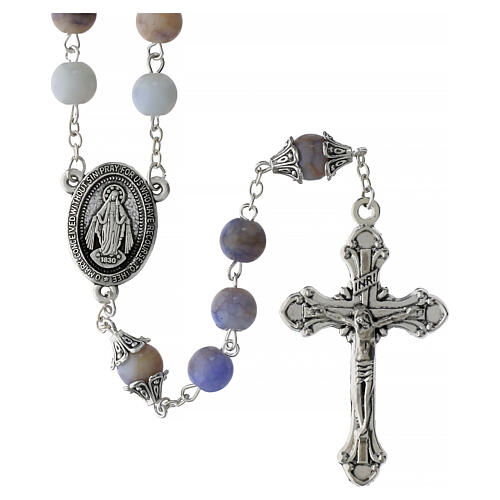 Chapelet dédié à Notre-Dame des Grâces avec grains en verre veinées bicolores (violet et blanc) avec bonnets doubles en verre et métal, reliées par une chaîne en métal argenté.