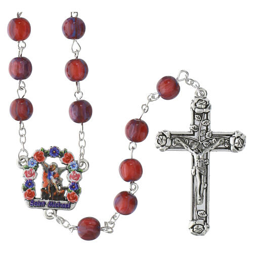 Chapelet dédié à Saint Michel Archange, composé de perles sphériques en résine marbrée dans les tonalités du rouge et du violet, avec bonnets doubles en verre et métal, diamètre 8 mm.