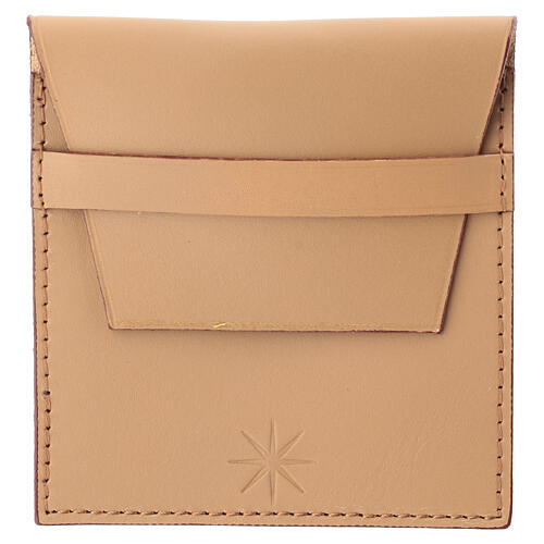 Étui réalisé en cuir lisse beige, travaillé à la main. Douce et agréable au toucher, cette pochette possède une fermeture en forme de poche, réalisée dans le même matériau et la même teinte, qui permet de ranger le chapelet de façon ordonnée et protégée.