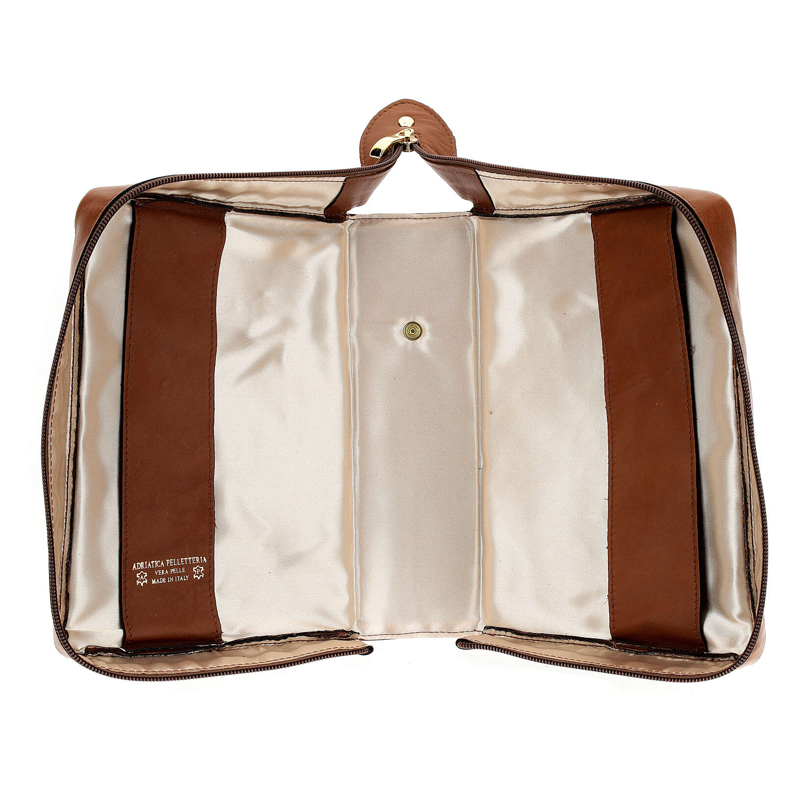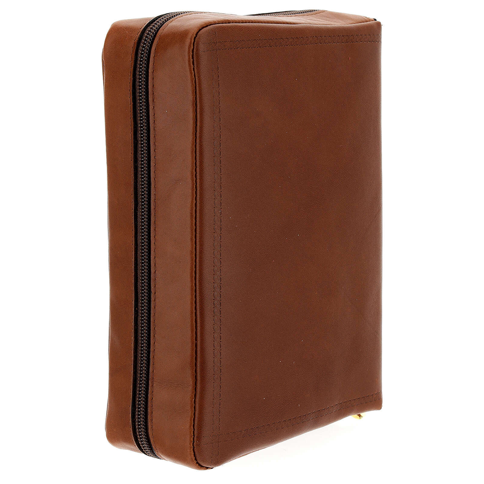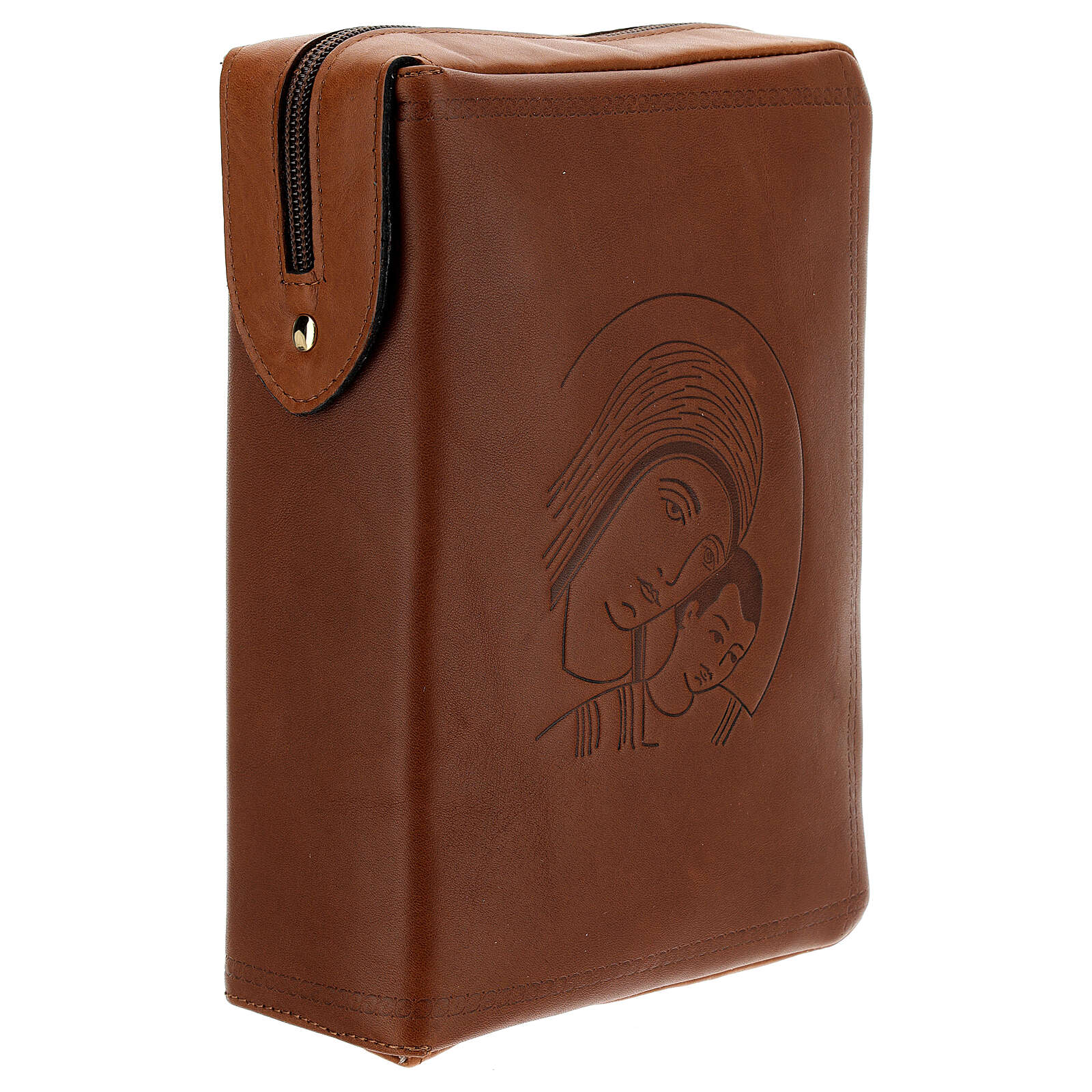 Couverture cuir végétal marron Vierge de Kiko pour Nouvelle Bible San Paolo 2020. Couverture pour la nouvelle Bible San Paolo, édition 2020, entièrement réalisée à la main par des artisans italiens en cuir végétal marron avec élégante doublure et fermeture éclair. Ce modèle est décoré sur la face avant par une représentation en relief de la Vierge de Kiko.