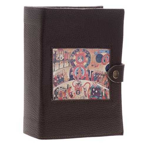 Couverture Néocatéchuménale Jugement universel en cuir marron foncé. Couverture avec image en style du chemin Néocatéchuménal. Entièrement réalisée à la main, la partie interne est en alcantara et fermeture avec bouton pression. L'image est imprimée sur du cuir et cousue sur le devant de l'étui. Le cuir marron foncé est opaque et doux au toucher.