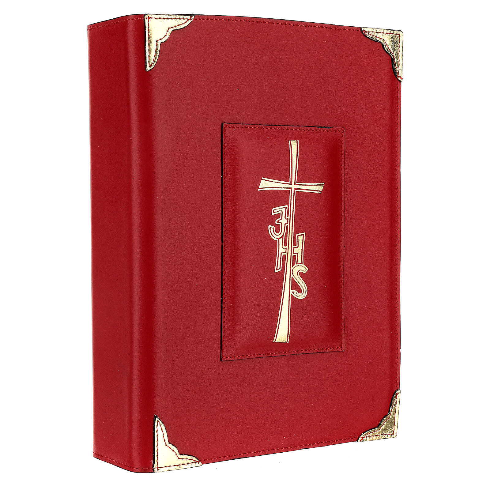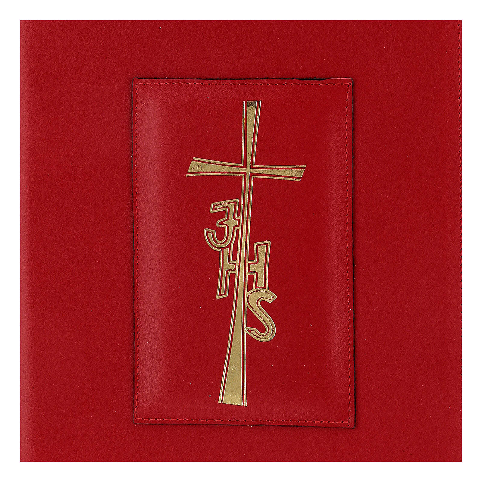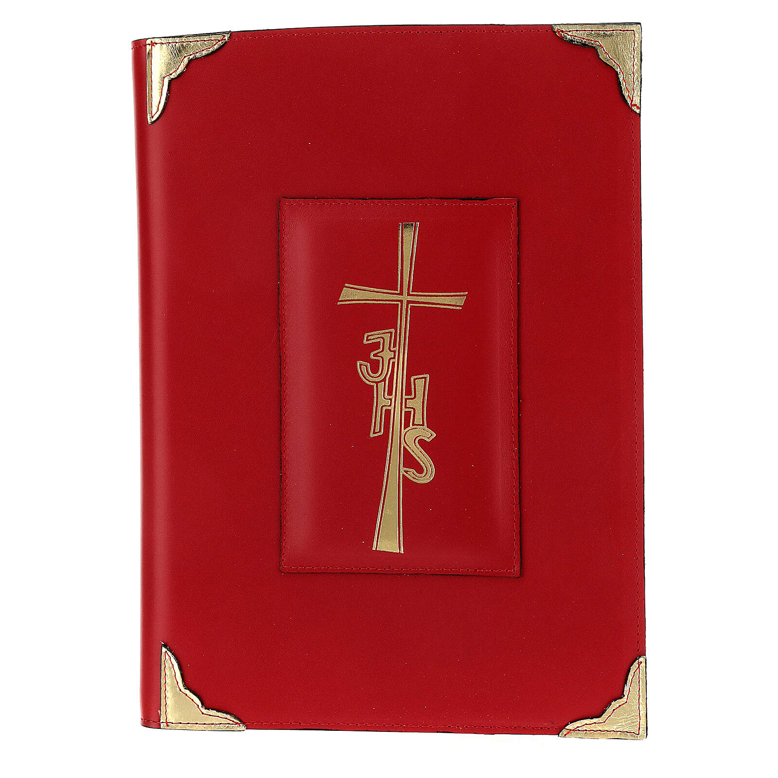 Couverture cuir véritable rouge IHS pour Missel Romain III ÉDITION. Couverture pour le Missel Romain III édition, entièrement manufacturée par des artisans italiens en cuir véritable rouge avec croix JHS imprimée en or sur les deux faces, intérieur cartonné et doublé en élégant satin et coutures latérales rendant la couverture résistante et adaptée à protéger efficacement le livre.