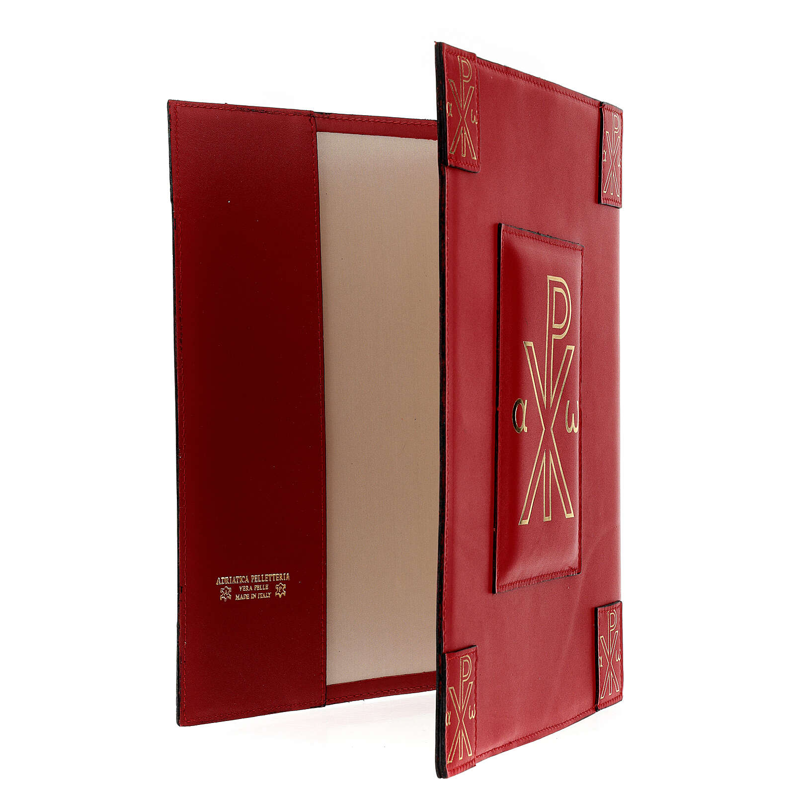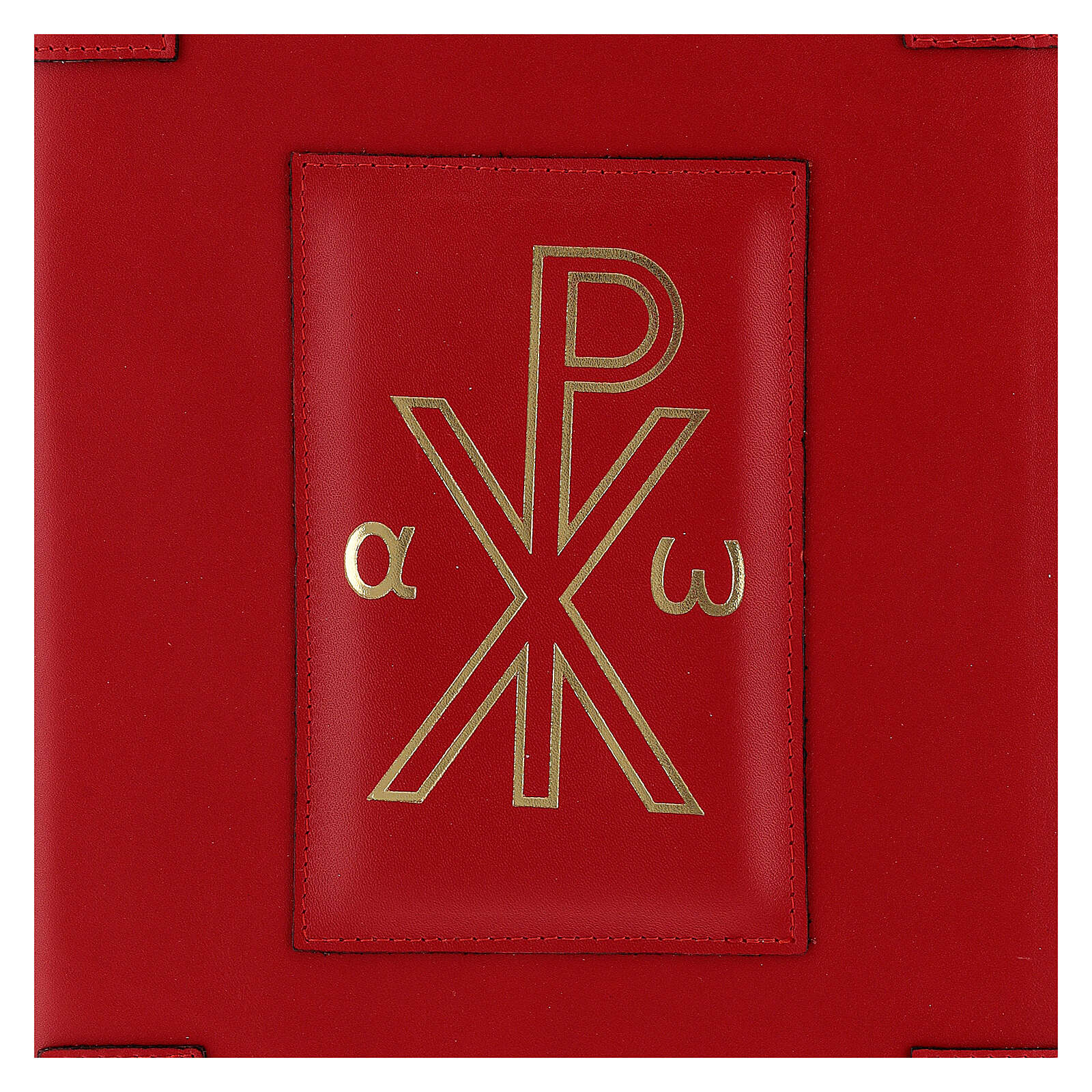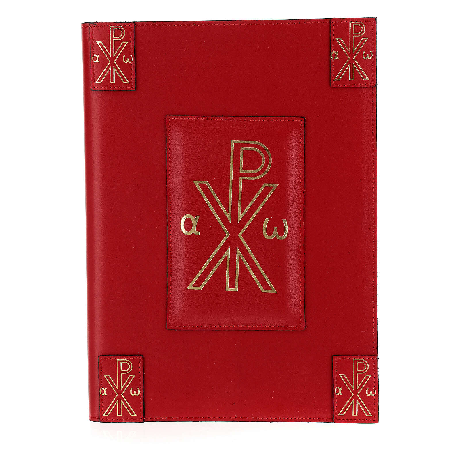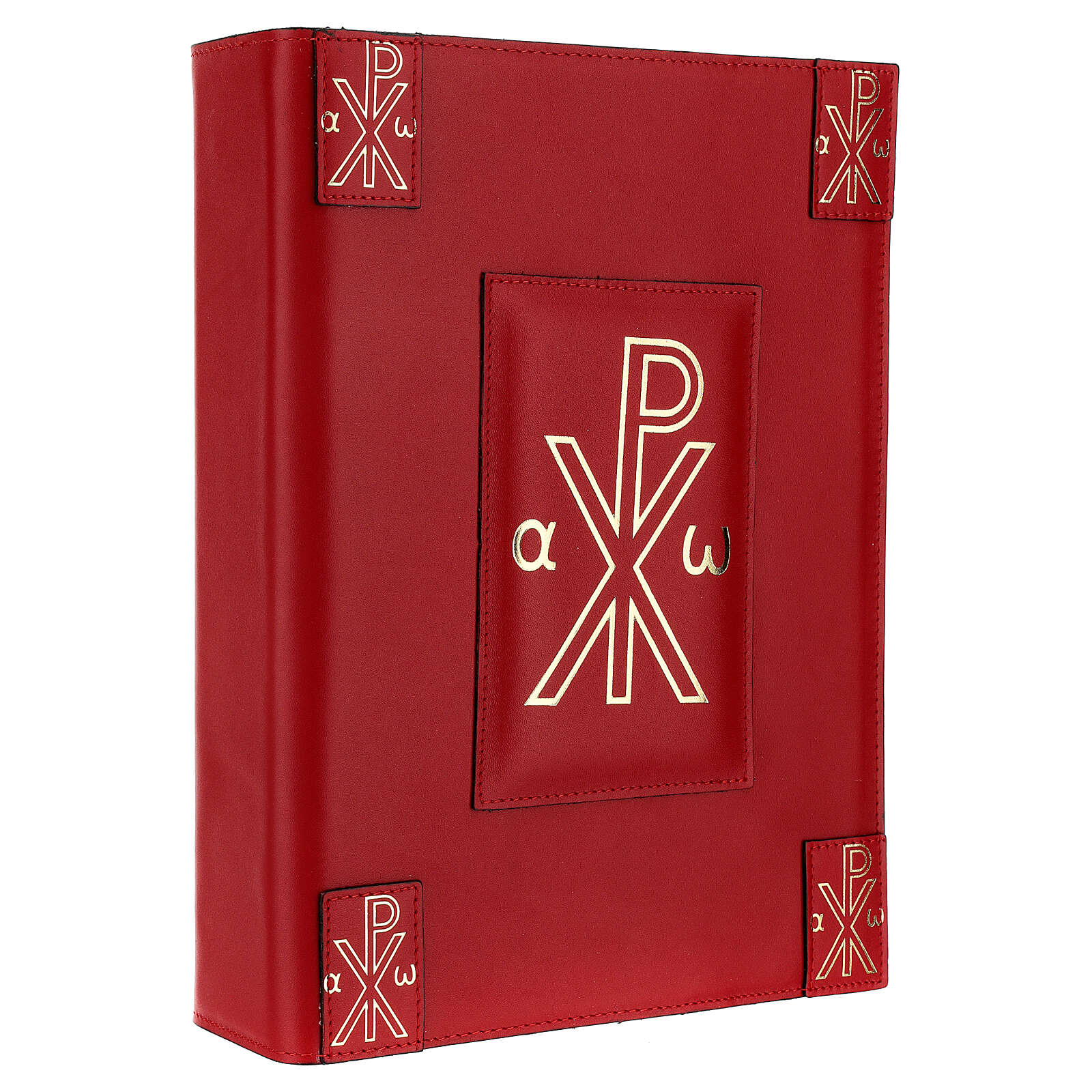 Couverture cuir véritable rouge pour Missel Romain III ÉDITION Chi-Rho. Couverture pour le Missel Romain III édition, entièrement manufacturée par des artisans italiens en cuir véritable rouge avec monogramme de Christ imprimé en or sur les deux faces, intérieur cartonné et doublé en élégant satin et coutures latérales rendant la couverture résistante et adaptée à protéger efficacement le livre.