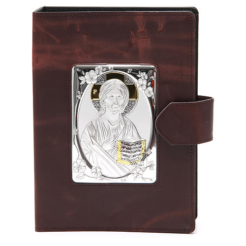 Couverture Missel Romain petit bas-relief cuir. Couverture pour Missel Romain petit format (édition Vatican) en cuir brun foncé avec bas-relief en bilaminé représentant l'image du Christ. L'intérieur est en alcantara, les coutures sont traversantes et unissent le dos en cuir à la doublure interne. Très robuste, ce modèle est adapté à un usage quotidien.