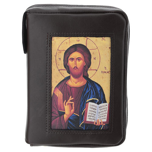 Couverture Bible Jérusalem brun foncé Pantocrator fermeture éclair. Couverture pour texte sacré en cuir brun foncé, très doux au toucher, faite à la main en Italie et dotée de fermeture éclair. Cet exemplaire aux coutures doubles est un article de grande qualité, très soigné dans les finitions, avec l'intérieur doublé.