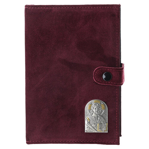 Couverture Bible Jérusalem suède bordeaux. Couverture pour Bible de Jérusalem en suède bordeaux avec plaque en métal à l'avant représentant Christ Pantocrator.Produit de réalisation artisanale : la couleur du cuir peut différer de la photo.
