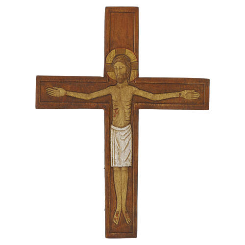 L'auréole, le visage, le flanc, les mains et la tunique sont réalisés en relief, offrant une surface riche en finitions qui accompagne le regard et la sensibilité tactile. Le contraste entre la tunique blanche et le fond marron de la croix met en valeur la figure du Christ et crée un équilibre chromatique qui rend ce crucifix particulièrement adapté à la prière et à la méditation.