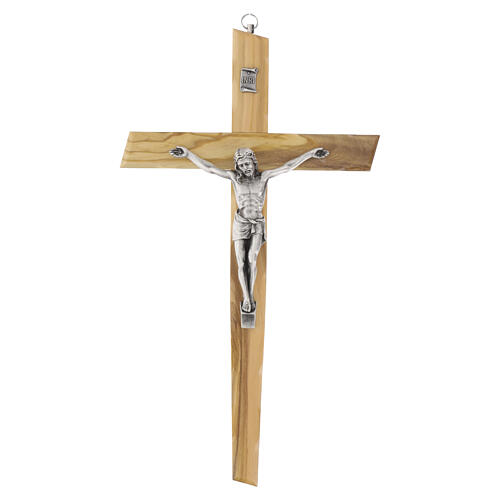 Crucifix artisanal en bois d'olivier, corps en alliage argenté, 30 cm.