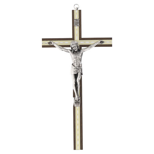 Crucifix en bois de charme foncé avec insert longitudinal couleur ivoire et corps argenté.