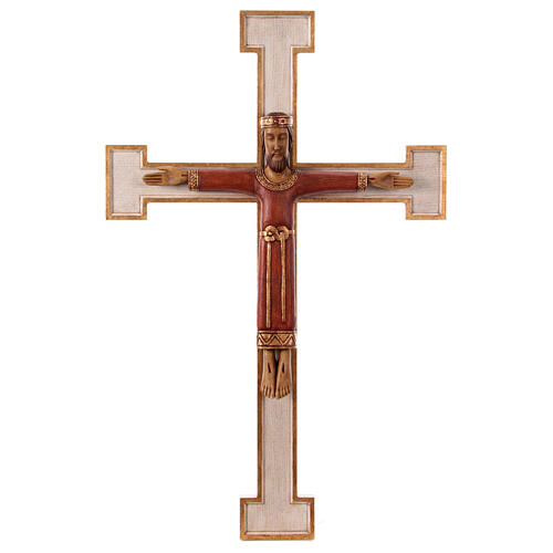 Crucifix, Christ prêtre et roi, en bois sur croix de grande taille, affichage au mur. Réalisé à la main par les soeurs du monastère de Bethléem en France. L'expression du visage de Christ est solennelle et limpide, les habits ont des bordures dorées et la couronne est élégante, en couleur or.