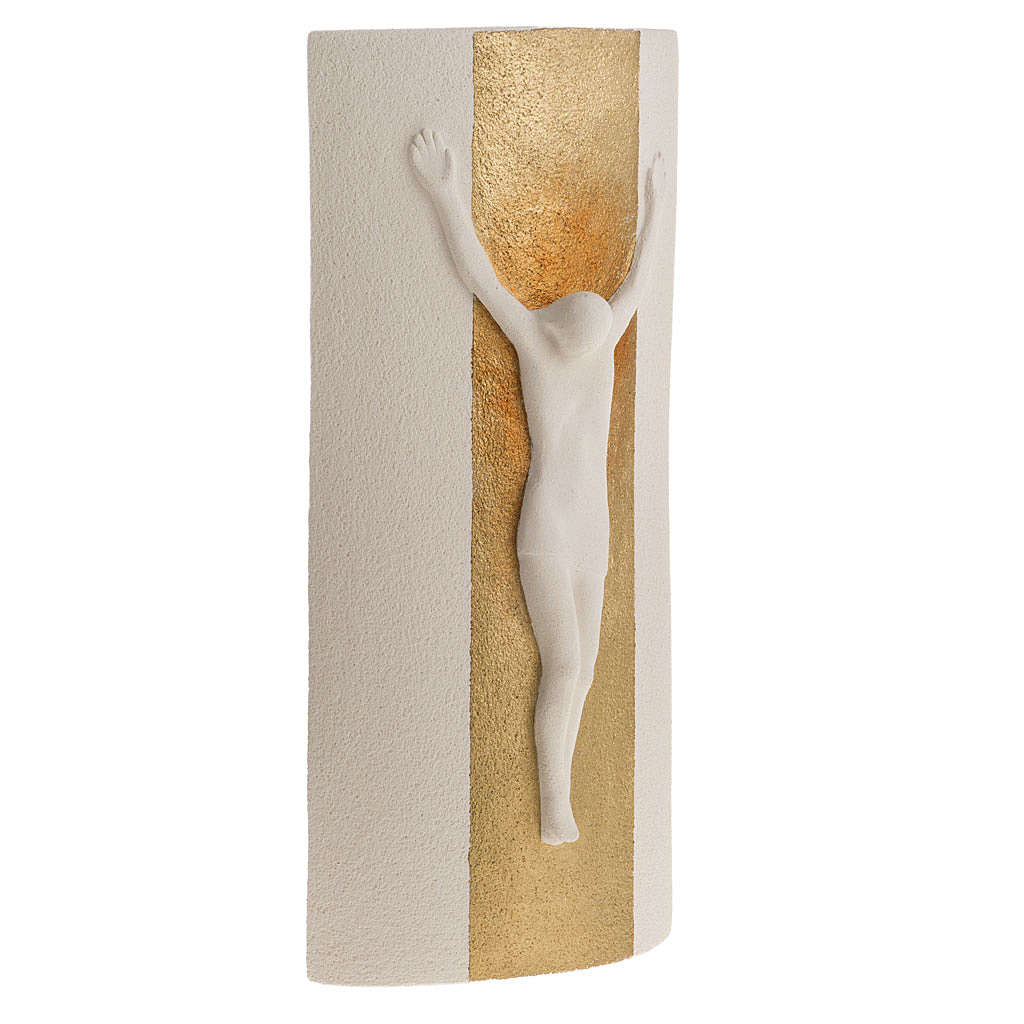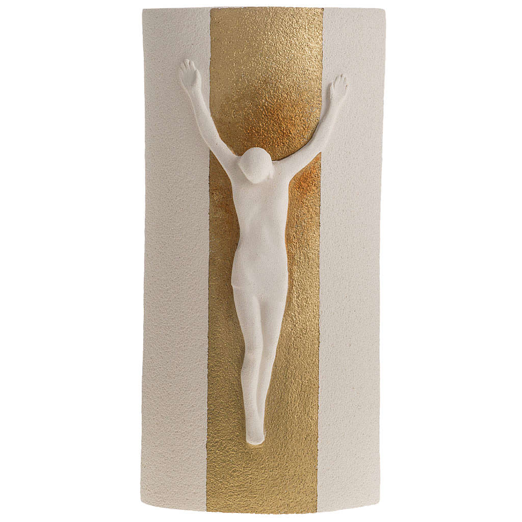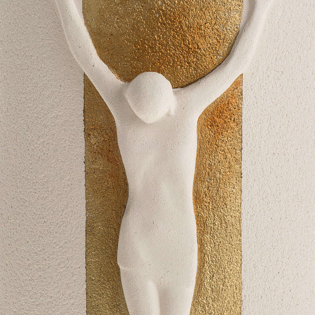 Crucifix en argile blanche et or modèle Stele. Le crucifix est réalisé à la main en Italie en argile réfractaire blanche et peinture or. Il est moulé et après cuit à plus de 1000°C. Le travail et la décoration de ce crucifix sont complètement réalisés à la main pour lui donner des lignes agréables et élégantes. Produit d'haute qualité de l'atelier Ave de Loppiano (Florance).