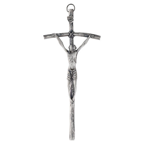 Réalisée en zamak avec finition argentée, cette croix murale reprend le modèle de Jean‑Paul II avec une forme allongée et une texture effet bois.