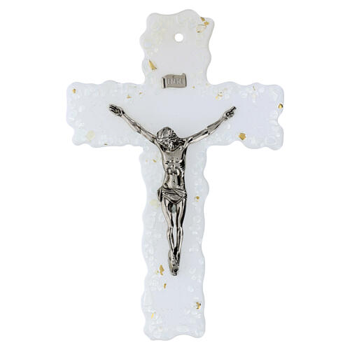 Croix murale de grandes dimensions en verre de Murano, caractérisée par un fond blanc avec incrustations transparentes et un corps du Christ en zamak argenté.