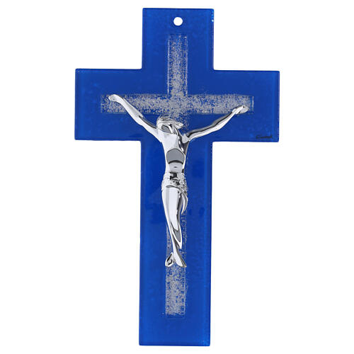 Crucifix bleu avec croix en relief décorée de paillettes et corps argenté moderne 25x15 cm