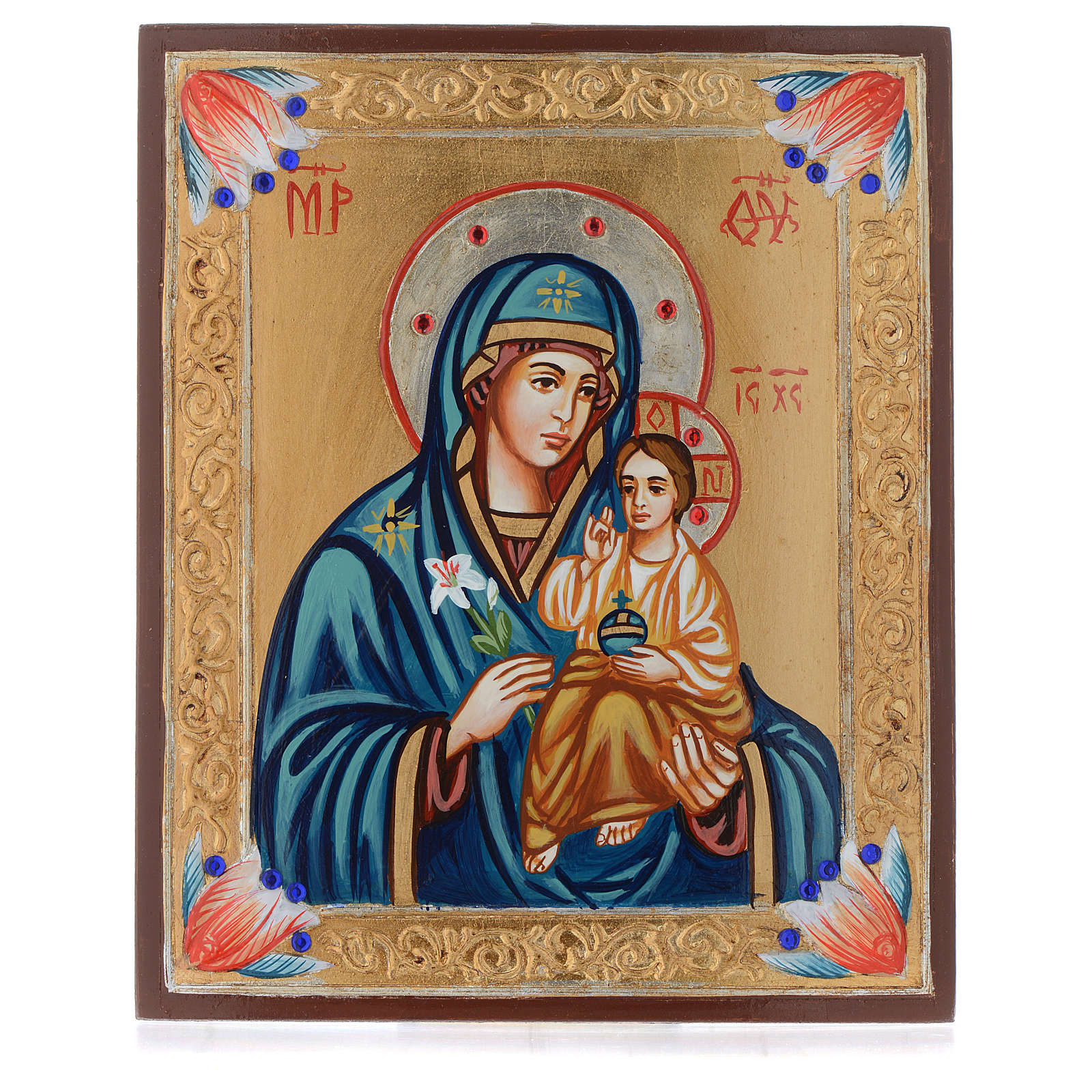 Icone Mère de Dieu Hodigitria. Représentation de la Vierge Hodigitria peinte à la main en Roumanie selon l'iconographie Byzantine. Livrée avec certificat d'origine.