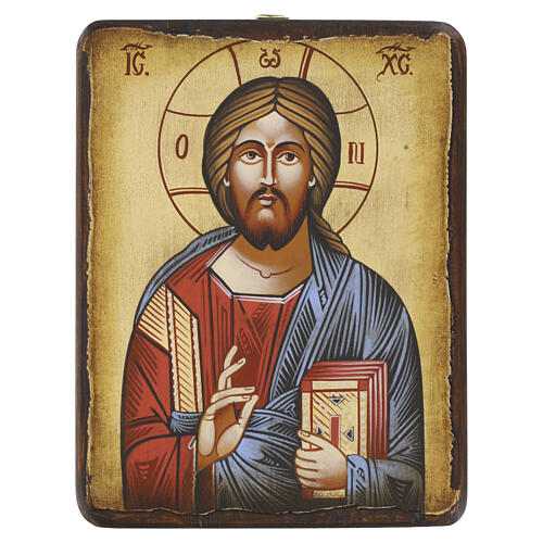 Icône Roumaine Christ Pantocrator tunique rouge aspect vieilli 18x15 cm