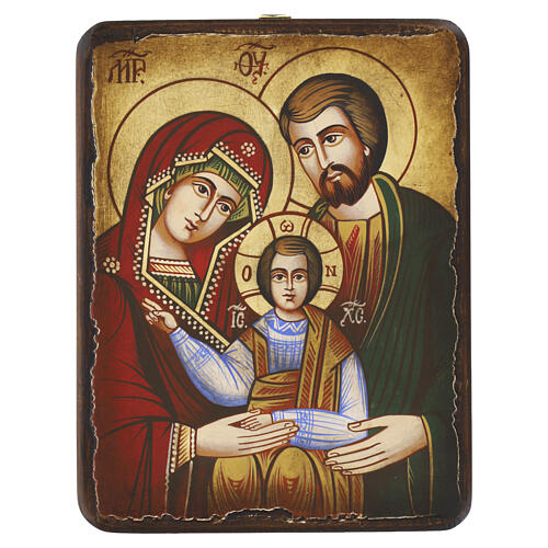 Icône Roumaine de la Sainte Famille peinte à la main 18x15 cm style vieilli.