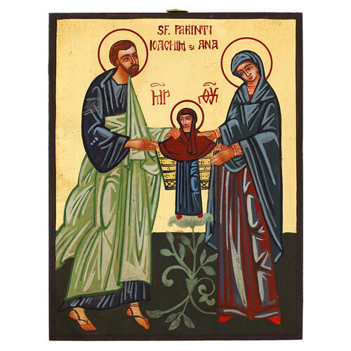 Icône réalisée selon la technique picturale byzantine, avec application de feuille d'or dans la partie supérieure illuminant et mettant en valeur chaque détail de la scène sacrée. Les sujets représentés sont Saint Joachim, Sainte Anne et la petite Marie, debout. Marie, au centre, tient la main de ses parents, exprimant une forte unité familiale et une protection mutuelle, soutenue par une fleur symbole de pureté et de grâce.