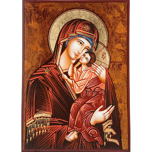 La Vierge de la tendresse exprime force et joie. Décorée à la main selon la tradition roumaine avec couleurs naturelles et feuille en or et reliefs en or.Livrée dans une boîte en velours bleu et intérieur en satin, fermeture en satin.