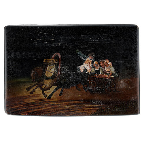 Boîte laque russe ancienne scène sur char 15x10x5 cm. Boîte en papier mâché avec couvercle peint, remontant à la fin du XIX début du XX siècle. Le couvercle montre une scène peinte avec un char tiré par un couple de cheveux lancés au galop. Sur le char sont assises quatre figures, deux hommes et deux femmes, en train de parler entre eux.