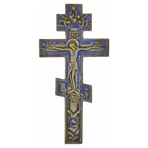 Magnifique crucifix orthodoxe russe en bronze avec émail bleu, datant du début du XIXe siècle, expression significative de la tradition iconographique de l'Europe orientale. La structure suit le modèle classique de la croix russe à trois traverses, avec celle inférieure inclinée, symbole de la « balance de la justice » : d'un côté, le bon larron au Paradis, de l'autre le méchant larron qui s'éloigne du salut.